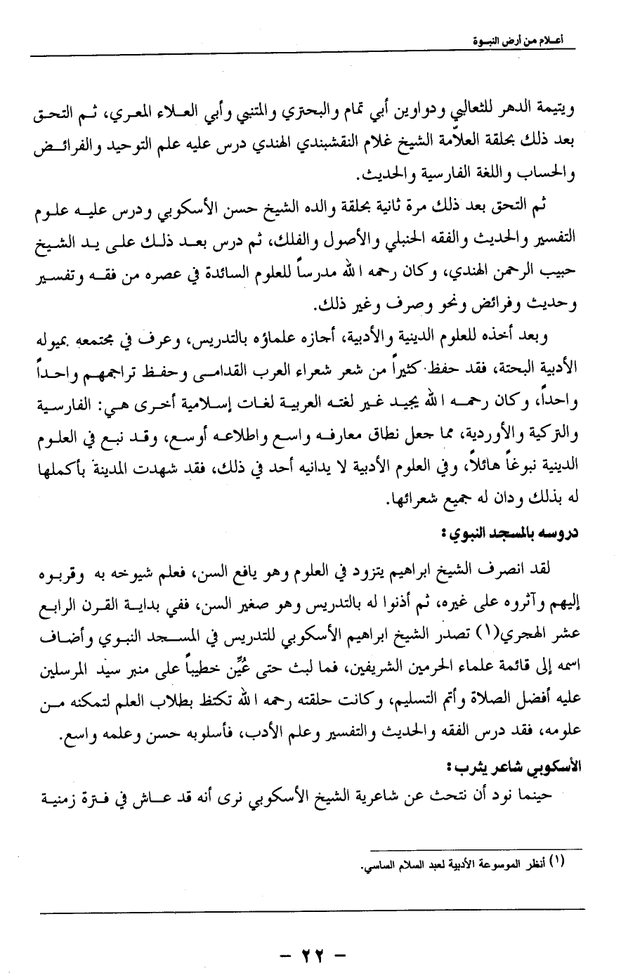 ثم التحق بعد ذلك مرة ثانية بحلقة والده الشيخ حسن الأسكوبي ودرس عليه علوم التفسير والحديث والفقه الحنبلي والأصول والفلك، ثم درس بعد ذلك على يد الشيخ حبيب الرحمن الهندي، وكان رحمه الله مدرساً للعلوم السائدة في عصره من فقه وتفسير وحديث وفرائض ونحو وصرف وغير ذلك.