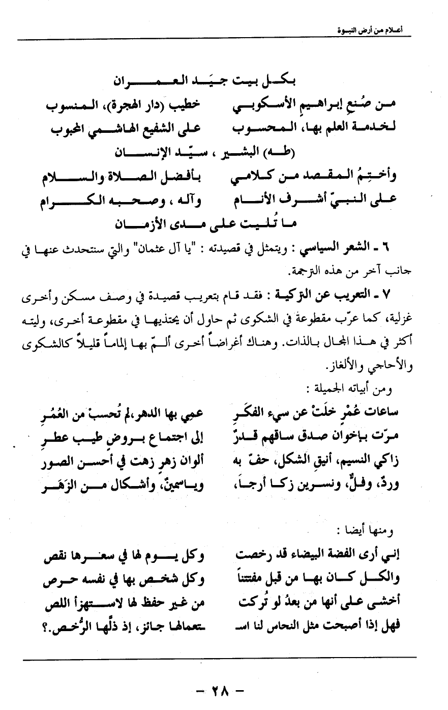 6 - الشعر السياسي: ويتمثل في قصيدته:" يا آل عثمان " والتي سنتحدث عنها في جانب آخر من هذه الترجمة.