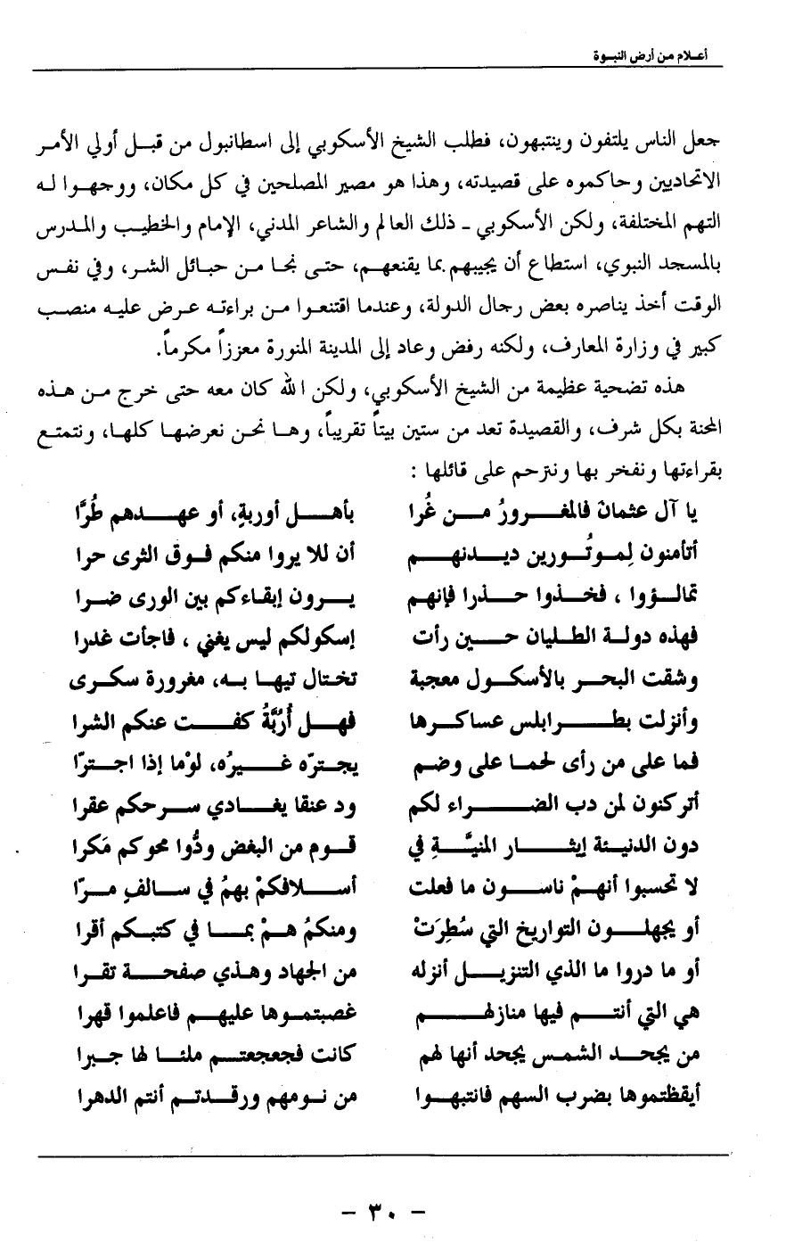 جعل الناس يلتفون وينتبهون، فطلب الشيخ الأسكوبي إلى اسطانبول من قبل أولي الأمر الاتحاديين وحاكموه على قصيدته، وهذا هو مصير المصلحين في كل مكان، ووجهوا له التهم المختلفة، ولكن الأسكوبي - ذلك العالم والشاعر المدني، الإمام والخطيب والمدرس بالمسجد النبوي، استطاع أن يجيبهم بما يقنعهم، حتى نجا من حبائل الشر، وفي نفس الوقت أخذ يناصره بعض رجال الدولة، وعندما اقتنعوا من براءته عرض عليه منصب كبير في وزارة المعارف، ولكنه رفض وعاد إلى المدينة المنورة معززاً مكرماً. هذه تضحية عظيمة من الشيخ الأسكوبي، ولكن الله كان معه حتى خرج من هذه المحنة بكل شرف، والقصيدة تعد من ستين بيتاً تقريباً، وها نحن نعرضها كلها، ونتمتع بقراءتها ونفخر بها ونترحم على قائلها.