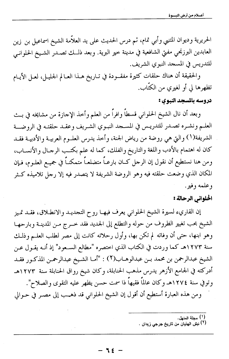 الحريرية وديوان المتنبي وأبي تمام، ثم درس الحديث على يد العلاّمة الشيخ إسماعيل بن زين العابدين البرزنجي مفتي الشافعية في مدينة خير البرية. وبعد ذلك تصدرر الشيخ الحلواني للتدريس في المسجد النبوي الشريف. والحقيقة أن هناك حلقات كثيرة مفقودة في تاريخ هذا العالم الجليل، لعل الأيام تظهرها لي أو لغيري من الكّتاب.