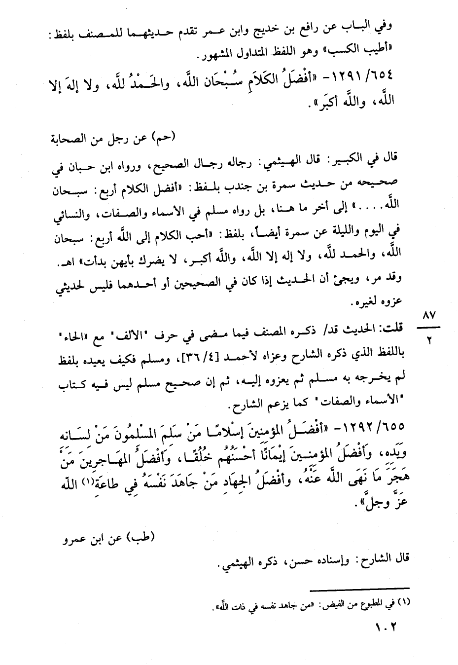 655/ 1292 - "أَفْضَلُ المؤمنينَ إسْلامًا مَنْ سَلِمَ المسْلِمُونَ مَنْ لِسَانِهِ وَيَدِهٍ، وَأَفْضَلُ المؤمِنِينَ إيْمَانًا أَحْسَنُهُم خُلُقًا، وأَفْضَلُ المُهَاجرينَ مَنْ هَجَر مَا نَهَى اللَّه عَنْهُ، وأَفْضَلُ الجِهَاد مَنْ جَاهَدَ نَفْسَهُ فِي طاعَةِ (¬1) اللَّه عَزَّ وجلَّ".