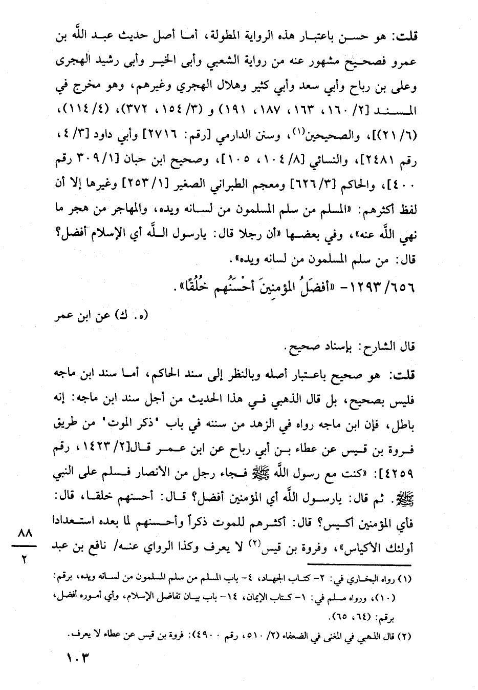 (¬1) رواه البخاري في: 2 - كتاب الجهاد، 4 - باب المسلم من سلم المسلمون من لسانه ويده، برقم: (10)، ورواه مسلم في: 1، كتاب الإيمان، 14 - باب بيان تفاضل الإسلام، وأي أموره أفضل، برقم: (64، 65).