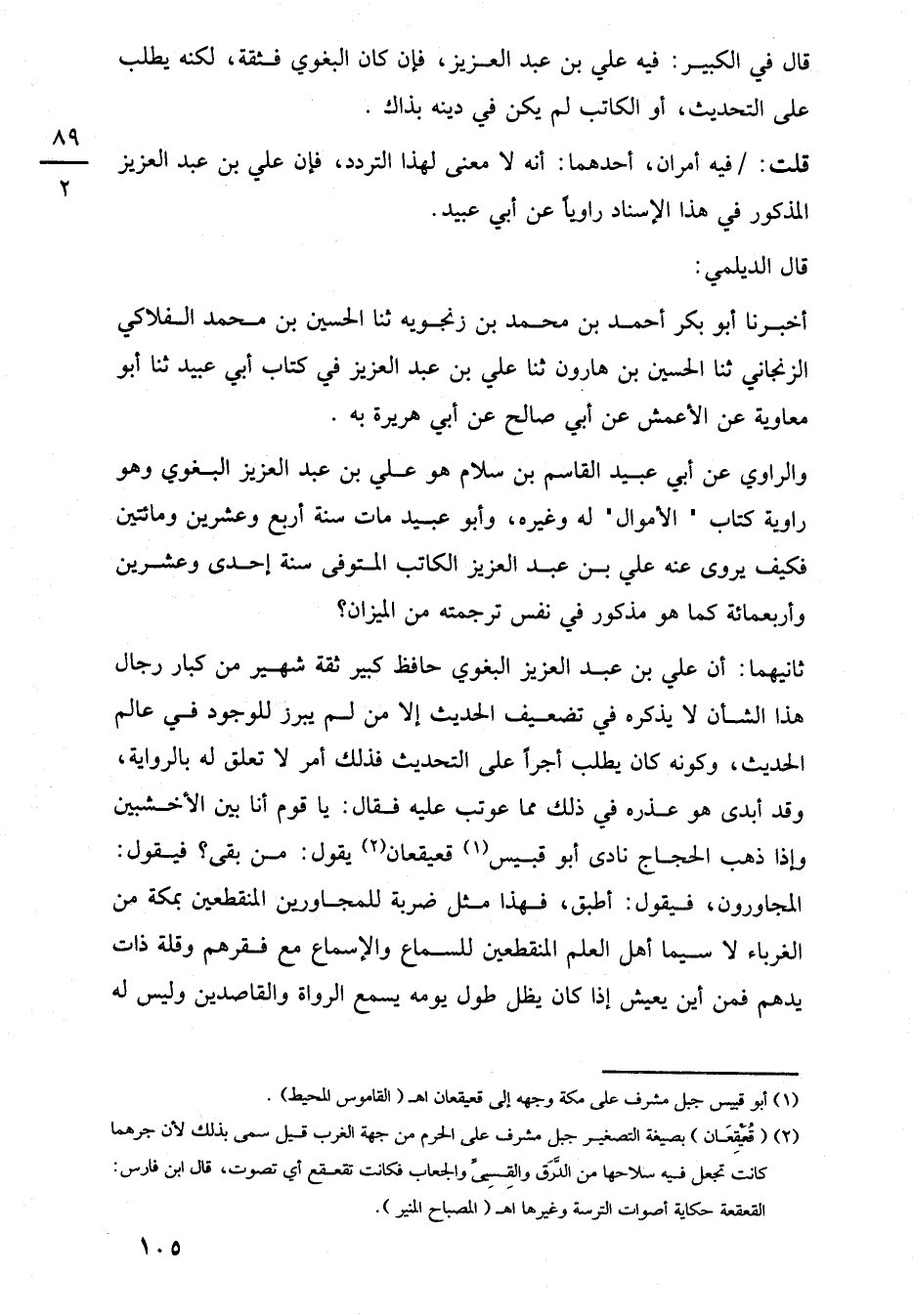 ثانيهما: أن علي بن عبد العزيز البغوي حافظ كبير ثقة شهير من كبار رجال هذا الشأن لا يذكره في تضعيف الحديث إلا من لم يبرز للوجود في عالم الحديث، وكونه كان يطلب أجرًا على التحديث فذلك أمر لا تعلق له بالرواية، وقد أبدى هو عذره في ذلك مما عوتب عليه فقال: يا قوم أنا بين الأخشبين وإذا ذهب الحجاج نادى أبو قبيس (¬1) قعيقعان (¬2) يقول: من بقى؟ فيقول: المجاورون، فيقول: أطبق، فهذا مثل ضربة للمجاورين المنقطعين بمكة من الغرباء لا سيما أهل العلم المنقطعين للسماع والإسماع مع فقرهم وقلة ذات يدهم فمن أين يعيش إذا كان يظل طول يومه يسمع الرواة والقاصدين وليس له