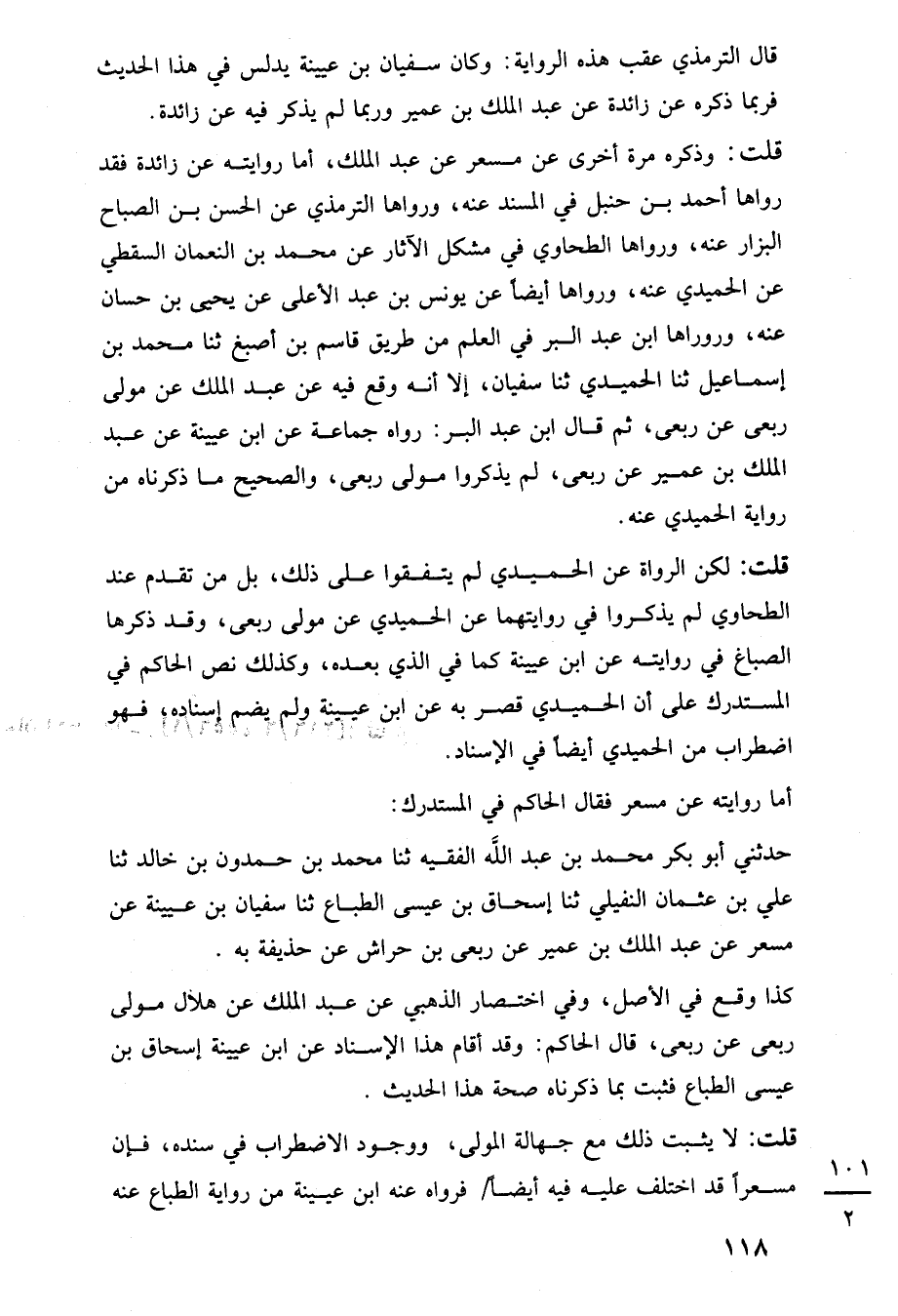 قلت: وذكره مرة أخرى عن مسعر عن عبد الملك، أما روايته عن زائدة فقد رواها أحمد بن حنبل في المسند عنه، ورواها الترمذي عن الحسن بن الصباح البزار عنه، ورواها الطحاوي في مشكل الآثار عن محمد بن النعمان السقطي عن الحميدي عنه، ورواها أيضًا عن يونس بن عبد الأعلى عن يحيى بن حسان عنه، وروراها ابن عبد البر في العلم من طريق قاسم بن أصبغ ثنا محمد بن إسماعيل ثنا الحميدي ثنا سفيان، إلا أنه وقع فيه عن عبد الملك عن مولى ربعى عن ربعى، ثم قال ابن عبد البر: رواه جماعة عن ابن عيينة عن عبد الملك بن عمير عن ربعى، لم يذكروا مولى ربعى، والصحيح ما ذكرناه من رواية الحميدي عنه.