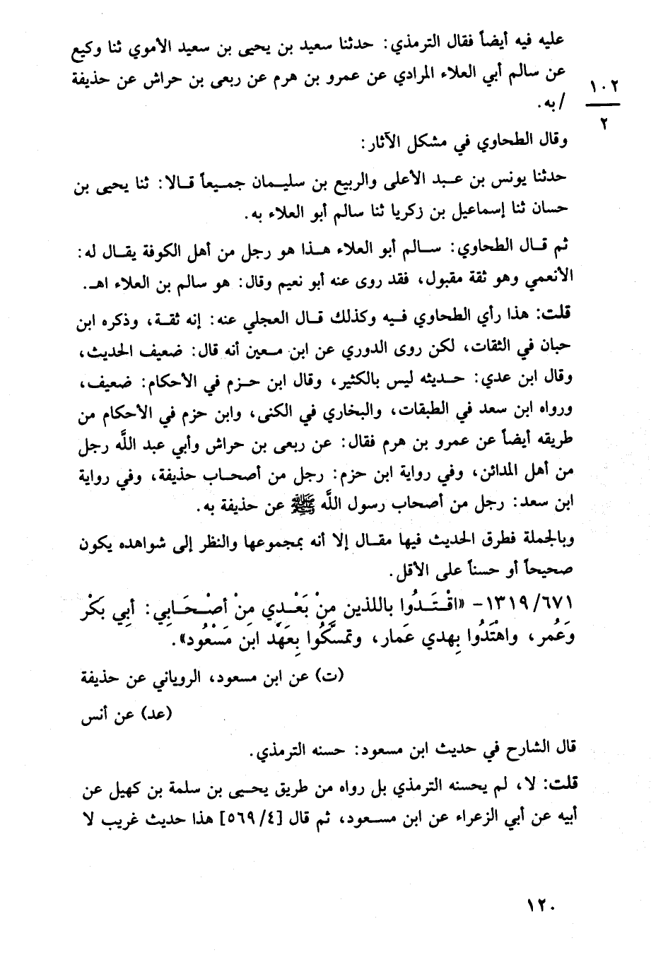 ثم قال الطحاوي: سالم أبو العلاء هذا هو رجل من أهل الكونة يقال له: الأنعمي وهو ثقة مقبول، فقد روى عنه أبو نعيم وقال: هو سالم بن العلاء اهـ.