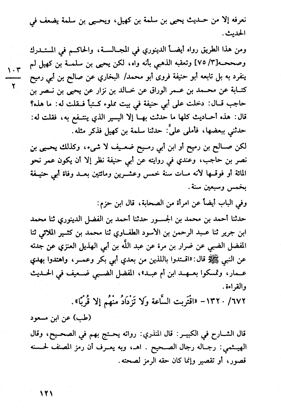 لكن صالح بن رميح أو ابن أبي رميح ضعيف لا شيء، وكذلك يحيى بن نصر بن حاجب، وعندي في روايته عن أبي حنيفة نظر إلا أن يكون عمر نحو المائة أو فوقها لأنه مات سنة خمس وعشرين ومائتين بعد وفاة أبي حنيفة بخمس وسبعين سنة.