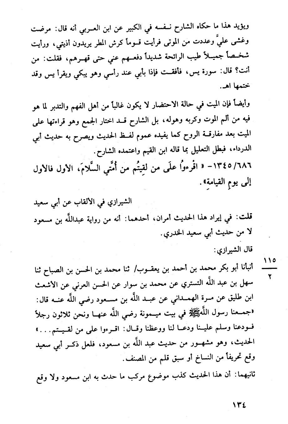 ويؤيد هذا ما حكاه الشارح نفسه في الكبير عن ابن العربي أنه قال: مرضت وغشى عليَّ وعددت من الموتى فرأيت قومًا كرش المطر يريدون أذيتي، ورأيت شخصًا جميلًا طيب الرائحة شديدًا دفعهم عني حتى قهرهم، فقلت: من أنت؟ قال: سورة يس، فأفقت فإذا بأبي عند رأسي وهو يبكي ويقرأ يس وقد ختمها اهـ.