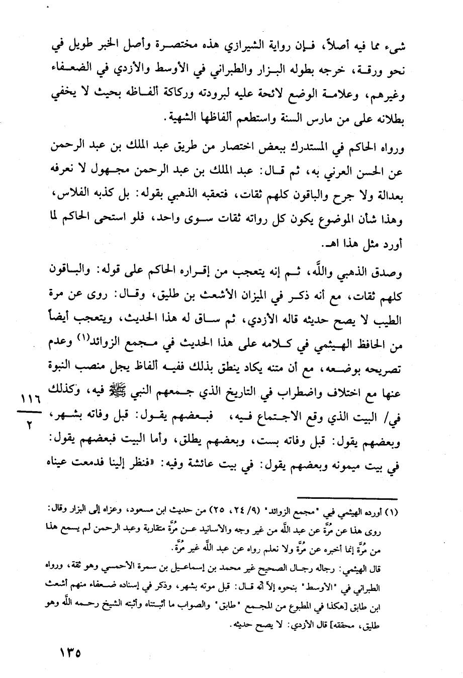 وصدق الذهبي واللَّه، ثم إنه يتعجب من إقراره الحاكم على قوله: والباقون كلهم ثقات، مع أنه ذكر في الميزان الأشعث بن طليق، وقال: روى عن مرة الطيب لا يصح حديثه قاله الأزدي، ثم ساق له هذا الحديث، ويتعجب أيضًا من الحافظ الهيثمي في كلامه على هذا الحديث في مجمع الزوائد (¬1) وعدم تصريحه بوضعه، مع أن متنه يكاد ينطق بذلك ففيه ألفاظ يجل منصب النبوة عنها مع اختلاف واضطراب في التاريخ الذي جمعهم النبي -صلى اللَّه عليه وسلم- فيه، وكذلك في البيت الذي وقع الاجتماع فيه، فبعضهم يقول: قبل وفاته بشهر، وبعضهم يقول: قبل وفاته بست، وبعضهم يطلق، وأما البيت فبعضهم يقول: في بيت ميمونه وبعضهم يقول: في بيت عائشة وفيه: "فنظر إلينا فدمعت عيناه