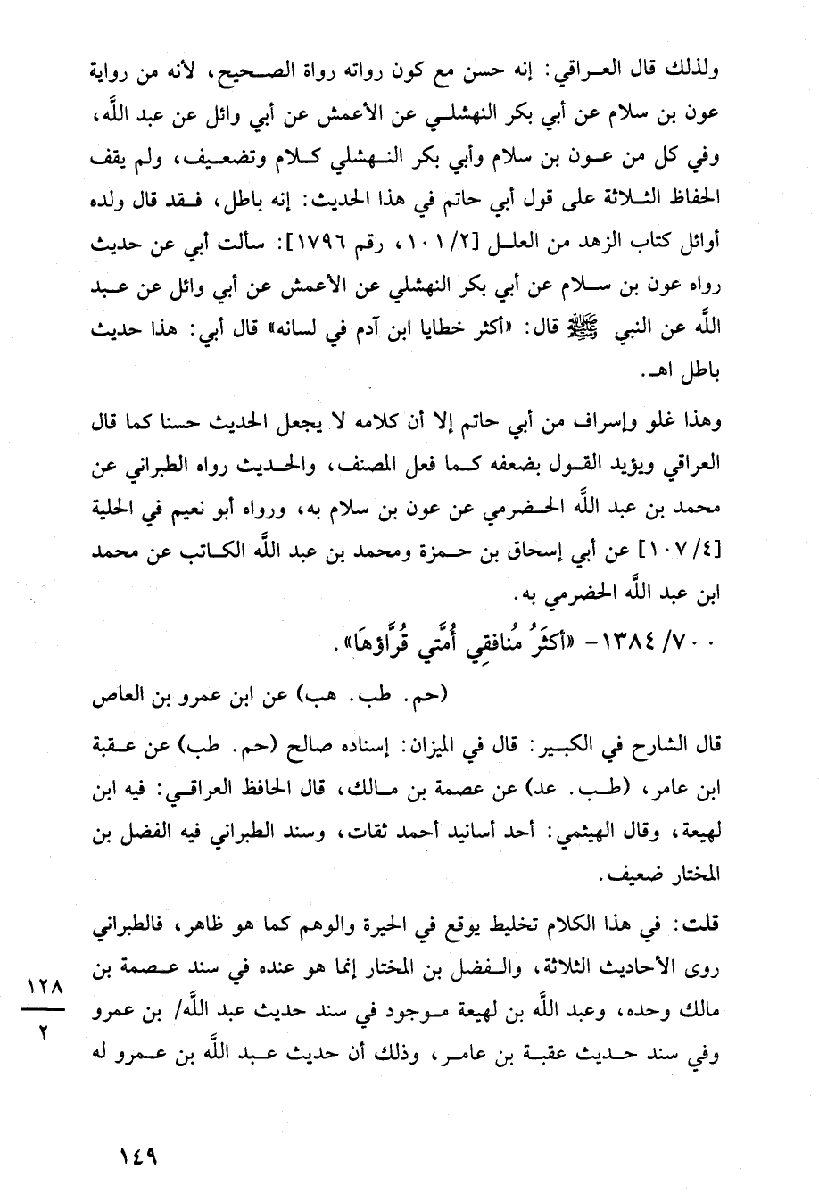 ولذلك قال العراقي: إنه حسن مع كون رواته رواة الصحيح، لأنه من رواية عون بن سلام عن أبي بكر النهشلي عن الأعمش عن أبي وائل عن عبد اللَّه، وفي كل من عون بن سلام وأبي بكر النهشلي كلام وتضعيف، ولم يقف الحفاظ الثلاثة على قول أبي حاتم في هذا الحديث: إنه باطل، فقد قال ولده أوائل كتاب الزهد من العلل [2/ 101، رقم 1796]: سألت أبي عن حديث رواه عون بن سلام عن أبي بكر النهشلي عن الأعمش عن أبي وائل عن عبد اللَّه عن النبي -صلى اللَّه عليه وسلم- قال: "أكثر خطايا ابن آدم في لسانه" قال أبي: هذا حديث باطل اهـ.