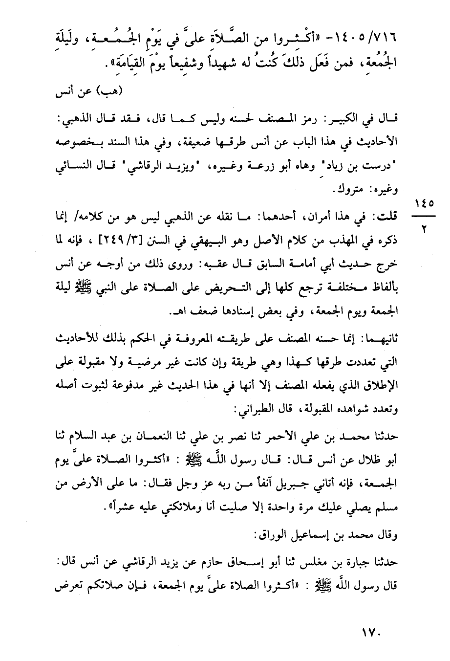 716/ 1405 - "أَكْثِروا من الصَّلَاةِ عليَّ في يَوْمِ الجُمُعةِ، ولَيلَةِ الجُمُعةِ، فمن فَعَل ذلَكَ كُنتُ له شهيدًا وشفِيعًا يوْمَ القِيَامَةِ".