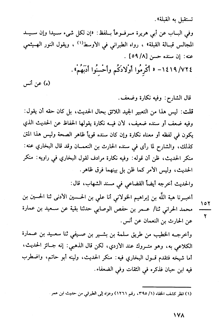 قلت: ليس هذا من التعبير الجيد اللائق بحال الحديث، بل كان حقه أن يقول: وفيه ضعف أو شده ضعيف، لأن فيه نكارة يقولها الحفاظ عن الحديث الذي يكون في لفظه أو معناه نكارة وإن كان شده قويًا ظاهر الصحة وليس هذا المتن كذلك، والشارح لما رأى في سنده الحارث بن النعمان وقد قال البخاري عنه: منكر الحديث، ظن أن قوله: وفيه نكارة مرادف لقول البخاري في راويه: منكر الحديث، وليس الأمر كما ظن بل بينهما فرق ظاهر.