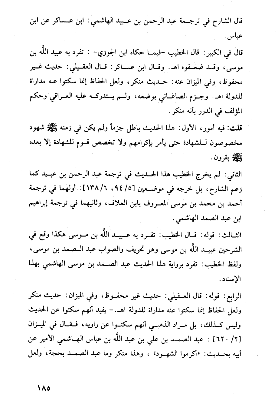 الرابع: قوله: قال العقيلي: حديث غير محفوظ، وفي الميزان: حديث منكر ولعل الحفاظ إنما سكتوا عنه مداراة للدولة اهـ. -يفيد أنهم سكتوا عن الحديث وليس كذلك، بل مراد الذهمي أنهم سكتوا عن راويه، فقال في الميزان [2/ 620]: عبد الصمد بن علي بن عبد اللَّه بن عباس الهاشمي الأمير عن أبيه بحديث: "أكرموا الشهود"، وهذا منكر وما عبد الصمد بحجة، ولعل