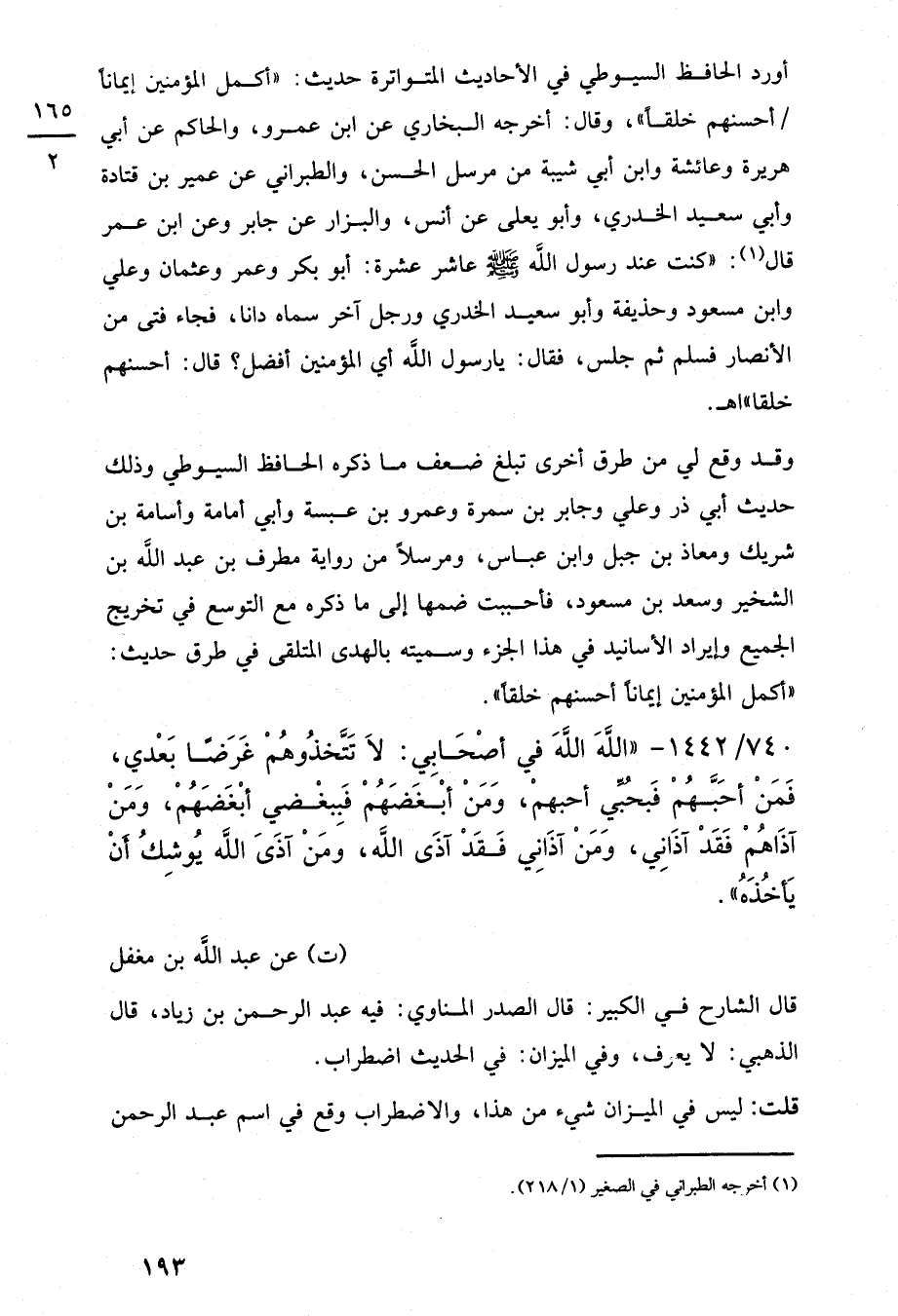 أورد الحافظ السيوطي في الأحاديث المتواترة حديث: "أكمل المؤمنين إيمانًا أحسنهم خلقًا"، وقال: أخرجه البخاري عن ابن عمرو، والحاكم عن أبي هريرة وعائشة وابن أبي شيبة من مرسل الحسن، والطبراني عن عمير بن قتادة وأبي سعيد الخدري، وأبو يعلى عن أنس، والبزار عن جابر وعن ابن عمر قال (¬1): "كنت عند رسول اللَّه -صلى اللَّه عليه وسلم- عاشر عشرة: أبو بكر وعمر وعثمان وعلي وابن مسعود وحذيفة وأبو سعيد الخدري ورجل آخر سماه دانا، فجاء فتى من الأنصار فسلم ثم جلس، فقال: يا رسول اللَّه أي المؤمنين أفضل؟ قال: أحسنهم خلقا" اهـ.