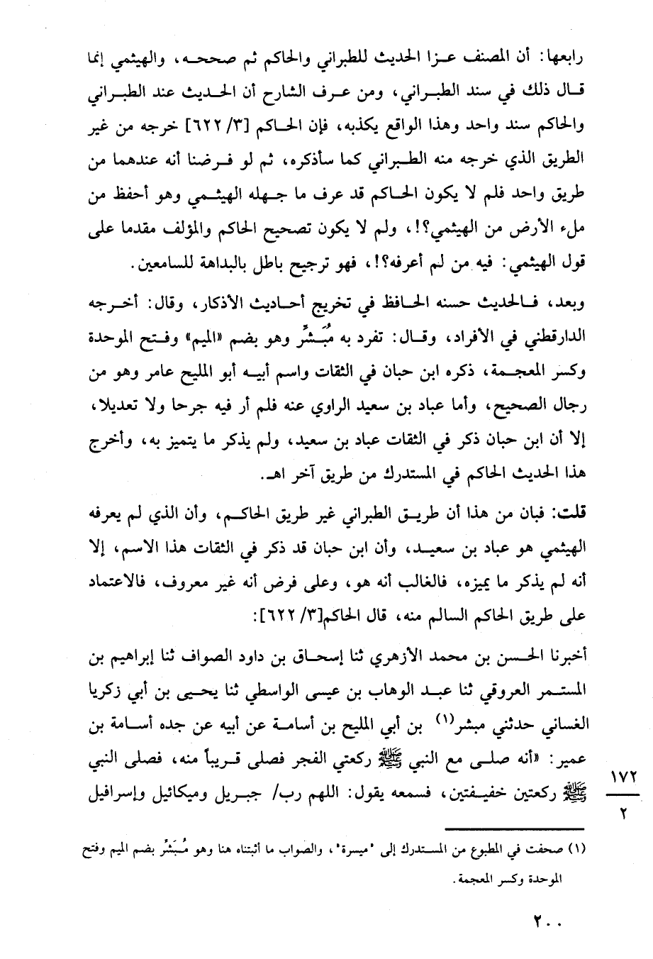 قلت: فبان من هذا أن طريق الطبراني غير طريق الحاكم، وأن الذي لم يعرفه الهيثمي هو عباد بن سعيد، وأن ابن حبان قد ذكر في الثقات هذا الاسم، إلا أنه لم يذكر ما يميزه، فالغالب أنه هو، وعلى فرض أنه غير معروف، فالاعتماد على طريق الحاكم السالم منه، قال الحاكم [3/ 622]: