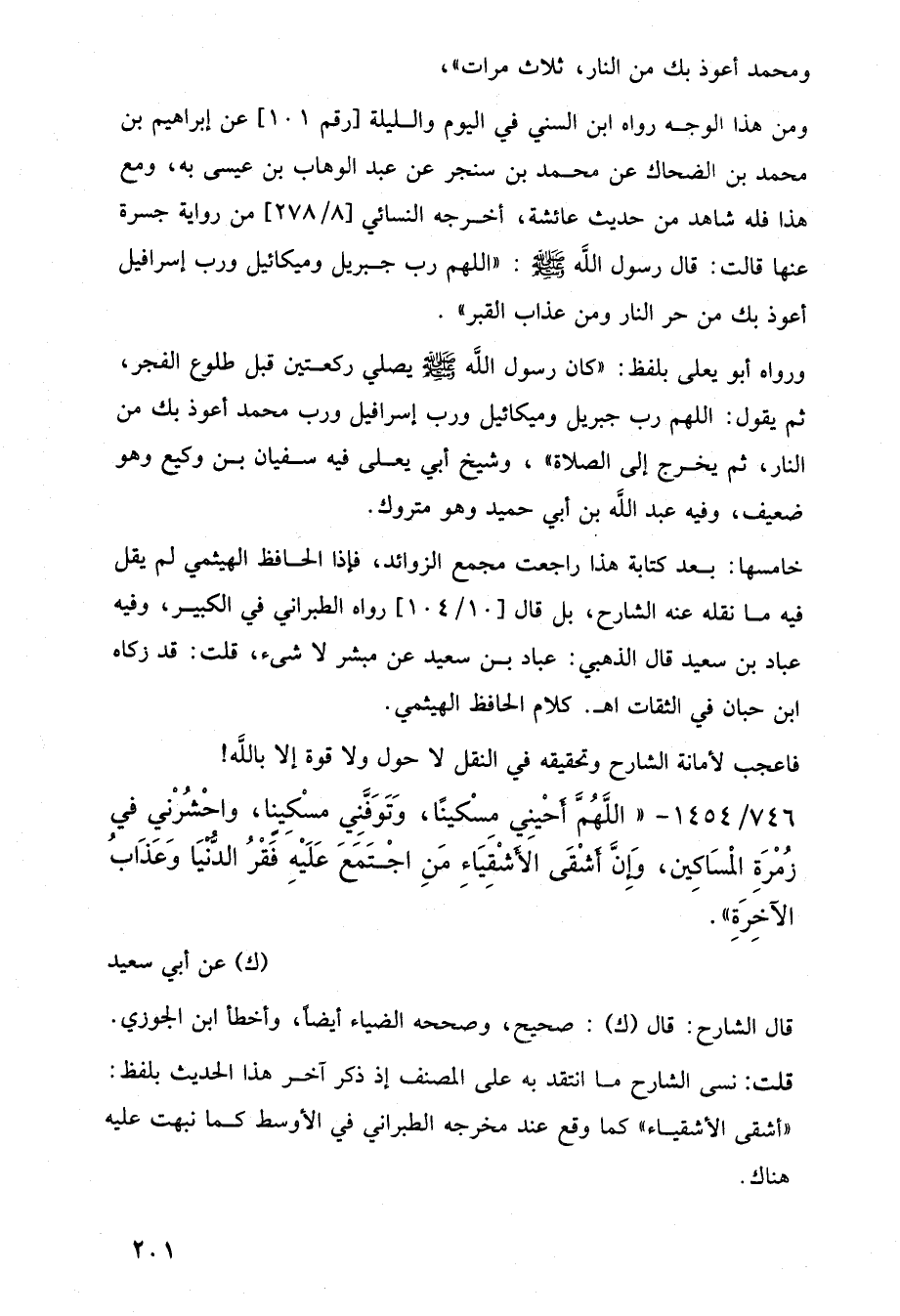 746/ 1454 - "اللَّهُمَّ أحْينِي مِسْكينًا، وَتَوَفَّنِي مسْكينًا، واحْشُرْنِي في زُمْرَةِ المْسَاكِين، وَإِنَّ أَشْقَى الأَشْقِيَاءِ مَنِ اجْتَمَعَ عَلَيْهِ فَقْرُ الدُّنْيَا وَعَذَابُ الآخِرَةِ".