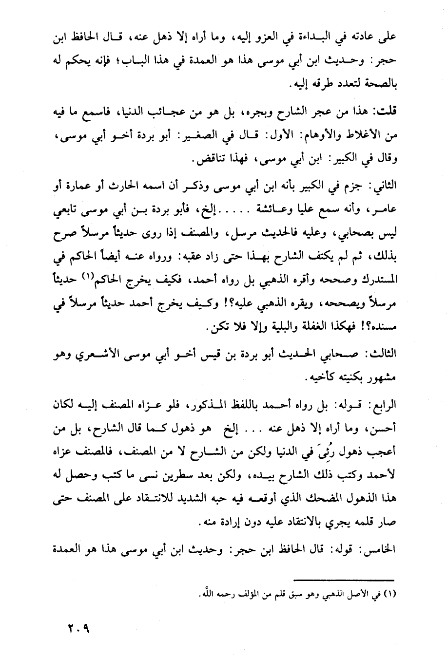 الرابع: قوله: بل رواه أحمد باللفظ المذكور، فلو عزاه المصنف إليه لكان أحسن، وما أراه إلا ذهل عنه. . . إلخ هو ذهول كما قال الشارح، بل من أعجب ذهول رُئِيَ في الدنيا ولكن من الشارح لا من المصنف، فالمصنف عزاه لأحمد وكتب ذلك الشارح بيده، ولكن بعد سطرين نسى ما كتب وحصل له هذا الذهول المضحك الذي أوقعه فيه حبه الشديد للانتقاد على المصنف حتى صار قلمه يجري بالانتقاد عليه دون إرادة منه.