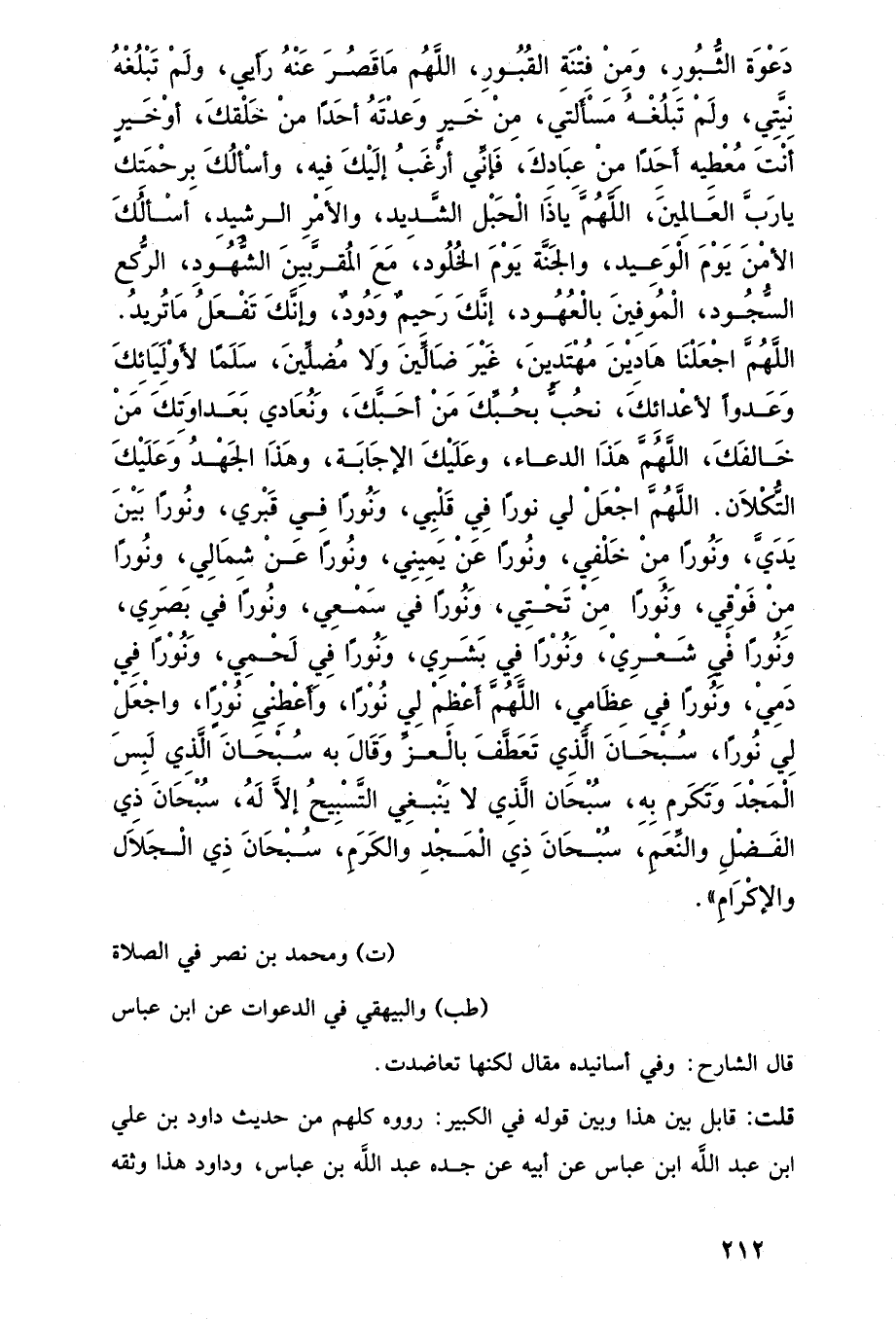 دَعْوَة الثُّبُورِ، وَمِنْ فتْنَة القُبُورِ، اللَّهُم مَا قَصُرَ عَنْهُ رَأيي، ولَمْ تَبْلُغْهُ نِيَّتِي، ولَمْ تَبلُغْهُ مَسْأَلتي، مِنْ خَير وَعدْتَهُ أحَدًا منْ خَلْقكَ، أوْ خَيرٍ أَنْتَ مُعْطِيه أَحَدًا منْ عِبَادكَ، فَإِنِّي أرْغَبُ إلَيْكَ فيه، وأسْألُكَ بِرحْمَتِك يا رَبَّ العَالِمينَ، اللَّهُمَّ ياذَا الْحَبْل الشَّديدِ، والأَمْرِ الرشيد، أسْألُكَ الأَمْنَ يَوْمَ الْوَعيد، والجَنَّة يَوْمَ الخُلُود، مَع المُقرَّبيِنَ الشُّهُودِ، الرُّكع السُّجُود، الْمُوفِينَ بالْعُهُود، إنَّكَ رَحيمٌ وَدُودٌ، وإنَّكَ تَفْعَلُ مَا تُريدُ. اللَّهُمَّ اجْعَلْنَا هَادِيْنَ مُهْتَدينَ، غَيْرَ ضَالِّينَ وَلا مُضلِّينَ، سَلَمًا لأَوْلِيَائِكَ وَعَدوًا لأعْدائِكَ، نحُبُّ بحُبِّكَ مَنْ أحَبَّكَ، وَنُعَادي بَعَداوَتِكَ مَنْ خَالفَكَ، اللَّهُمَّ هَذَا الدعاء، وعَلَيْكَ الإجَابَة، وهَذَا الجَهْدُ وَعَلَيْكَ التُّكْلَان. اللَّهُمَّ اجْعَلْ لي نورًا فِي قَلْبِي، وَنُورًا فِي قَبْري، ونُورًا بَيْنَ يَدَيَّ، وَنُورًا مِنْ خَلْفِي، ونُورًا عَن يَمِينِي، ونُورًا عَنْ شِمَالِي، ونُورًا مِنْ فَوْقِي، وَنُورًا مِنْ تَحْتِي، وَنُورًا في سَمْعِي، ونُورًا في بَصَرِي، وَنُورًا فْى شَعْرِي، وَنُوْرًا في بَشَرِي، وَنُورًا فِي لَحْمِي، وَنُوْرًا فِي دَمِي، وَنُورًا فِى عِظَامي، اللَّهُمَّ أَعْظِمْ لِي نُوْرًا، وَأَعْطِنْى نُوْرًا، واجْعَلْ لِي نُورًا، سُبْحَانَ الَّذِي تَعَطَّفَ بالْعزِّ وَقَالَ به سُبْحَانَ الَّذي لَبِسَ الْمَجْدَ وَتَكَرَم بِهِ، سُبْحَان الَّذِي لا يَنْبغِي التَّسْبِيحُ إلا لَهُ، سُبْحَانَ ذي الفَضْلِ والنِّعَمَ، سُبْحَانَ ذِي الْمَجْدِ والكَرَمِ، سُبْحَانَ ذِي الْجَلَال والإِكْرَامِ".