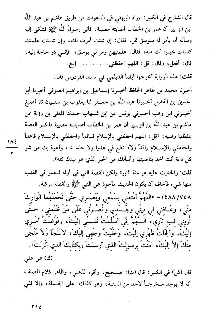 أخبرنا محمد بن طاهر الحافظ أخبرنا إسماعيل بن إبراهيم الصوفي أخبرنا أبو الحسين بن الفضل أخبرنا عبد اللَّه بن جعفر ثنا يعقوب بن سفيان ثنا أصبغ أخبرنى ابن وهب أخبرني يونس عن ابن شهاب حدثنا المعلى بن رؤبة عن هاشم بن عبد اللَّه بن الزبير أن عمر بن الخطاب أصابته مصيبة فذكر القصة بلفظها وفيه: "قل: اللهم احفظني بالإسلام قائمًا واحفظني بالإسلام قاعدًا واحفظني بالإسلام راقدًا ولا تطع في عدوا ولا حاسدا، وأعوذ بك من شر كل دابة أنت آخذ بناصيتها وأسألك من الخير الذي هو بيدك كله".