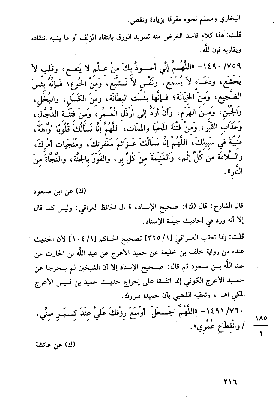 759/ 1490 - "اللَّهُمَّ إنِّي أعوذُ بكَ مِنْ عِلْمٍ لا يَنفع، وقَلبٍ لَا يَخْشَع، ودعَاءٍ لَا يُسْمَع، ونَفْسٍ لَا تَشْبَع، ومِنْ الجُوع؛ فَإنَّهُ بِئسَ الضَّجيع، وَمِنَ الخيَانَة؛ فإنَّها بئْسَت البِطَانَة، ومِنَ الكَسَلِ، والبُخْلِ، وَالجُبْنِ، وَمِنَ الهَرَمِ، وَأنْ أرَدُّ إلى أَرْذَلِ الْعُمُرِ، وَمِنْ فِتْنَة الدَّجَّالِ، وَعَذَابِ القَبْر، وَمِنْ فتْنَة المَحْيَا والممَات، اللَّهُمَّ إنَّا نَسْأَلُكَ قُلُوبًا أوَّاهَةً، مُنِيْبَةً في سَبِيلِكَ، اللَّهُمَّ إنَّا نَسْأَلُكَ عَزَائمَ مَغْفرتِكَ، ومُنْجَيات أمْرِكَ، واَلسَّلامَة من كُلِّ إثْم، وَالغَنِيمَةَ مِنْ كُلِّ بِر، والفَوْزَ بِالجنَّة، والنَّجَّاةَ مِنَ النَّارِ".