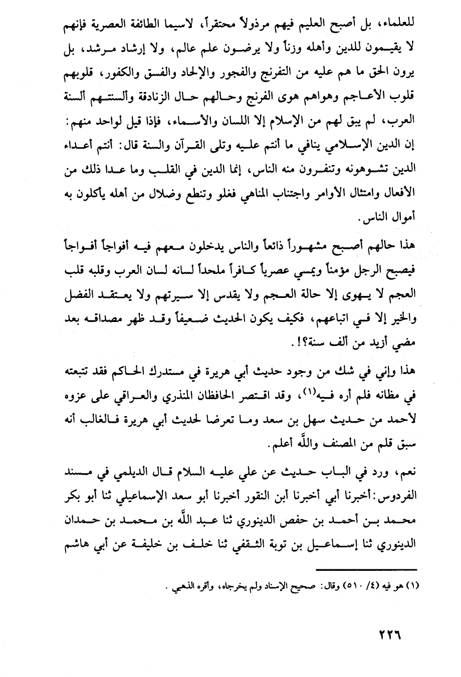 هذا حالهم أصبح مشهورًا ذائعًا والناس يدخلون معهم فيه أفواجًا أفواجًا فيصبح الرجل مؤمنًا ويمسي عصريًا كافرًا ملحدًا لسانه لسان العرب وقلبه قلب العجم لا يهوى إلا حالة العجم ولا يقدس إلا سيرتهم ولا يعتقد الفضل والخير إلا في اتباعهم، فكيف يكون الحديث ضعيفًا وقد ظهر مصداقه بعد مضي أزيد من ألف سنة؟!.