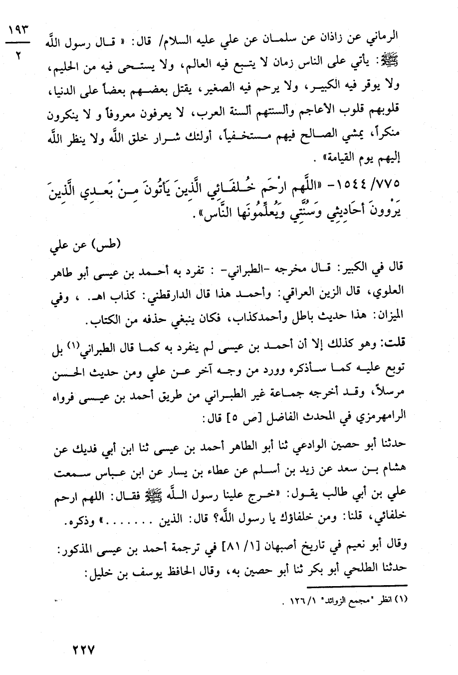775/ 1544 - "اللَّهم ارْحَم خُلفَائِي الَّذِينَ يَأتُونَ مِنْ بَعدِي الَّذِينَ يَرْوونَ أحَادِيثِي وَسُنَّتِي وَيُعلِّمُونَها النَّاس".