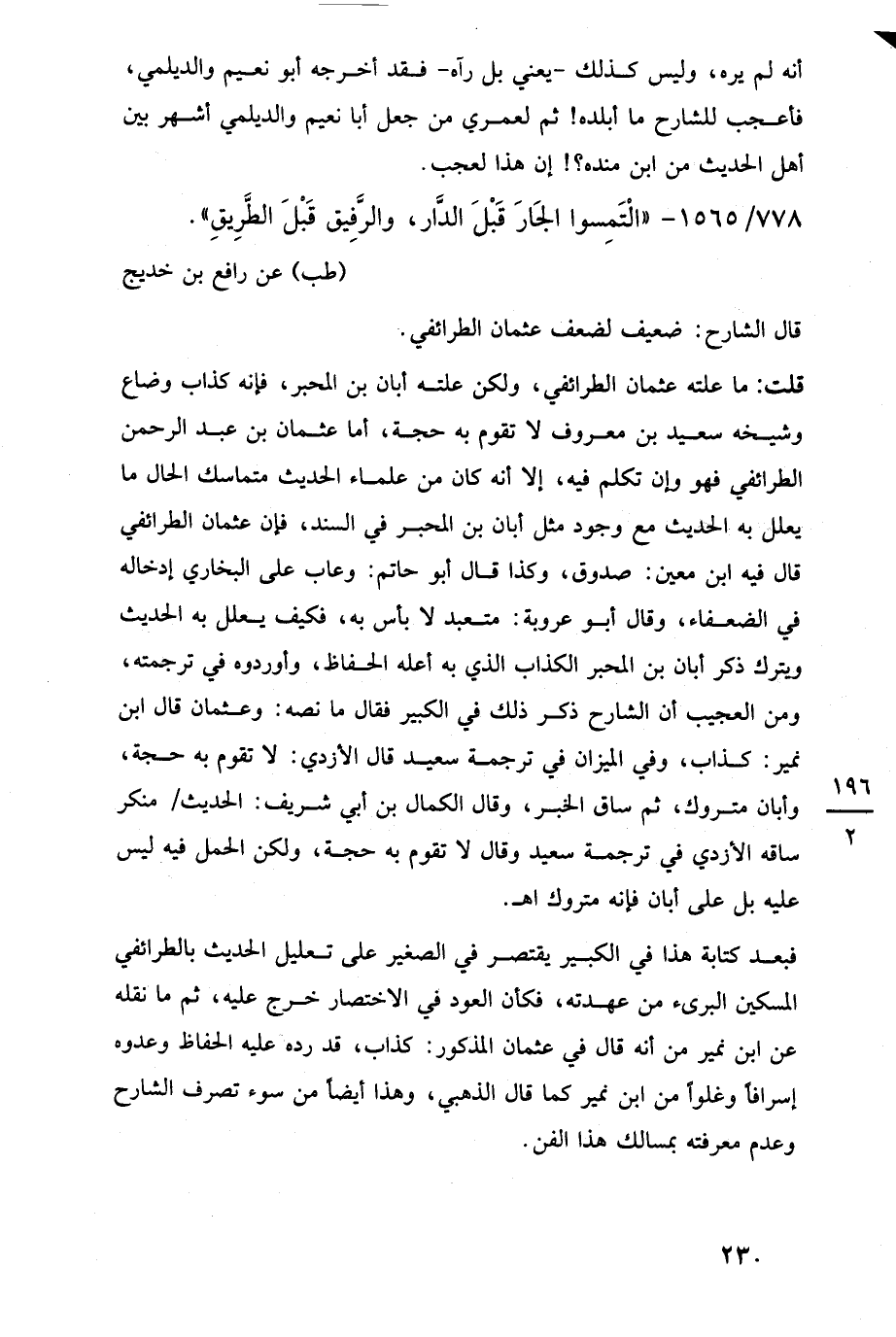 فبعد كتابة هذا في الكبير يقتصر في الصغير على تعليل الحديث بالطرائفي المسكين البرئ من عهدته، فكأن العود في الاختصار خرج عليه، ثم ما نقله عن ابن نمير من أنه قال في عثمان المذكور: كذاب، قد رده عليه الحفاظ وعدوه إسرافًا وغلوًا من ابن نمير كما قال الذهبي، وهذا أيضًا من سوء تصرف الشارح وعدم معرفته بمسالك هذا الفن.