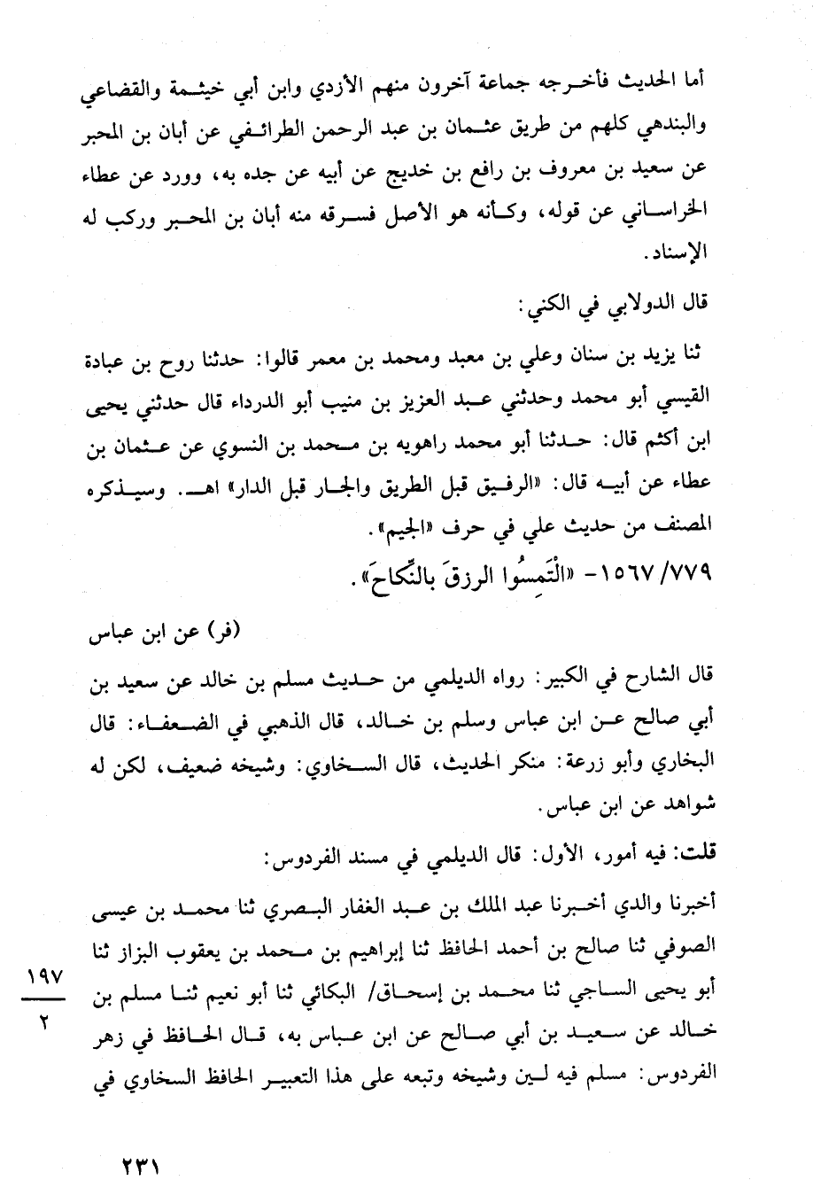 أخبرنا والدي أخبرنا عبد الملك بن عبد الغفار البصري ثنا محمد بن عيسى الصوفي ثا صالح بن أحمد الحافظ ثنا إبراهيم بن محمد بن يعقوب البزاز ثنا أبو يحيى الساجي ثنا محمد بن إسحاق البكائي ثنا أبو نعيم ثنا مسلم بن خالد عن سعيد بن أبي صالح عن ابن عباس به، قال الحافظ في زهر الفردوس: مسلم فيه لين وشيخه وتبعه على هذا التعبير الحافظ السخاوي في
