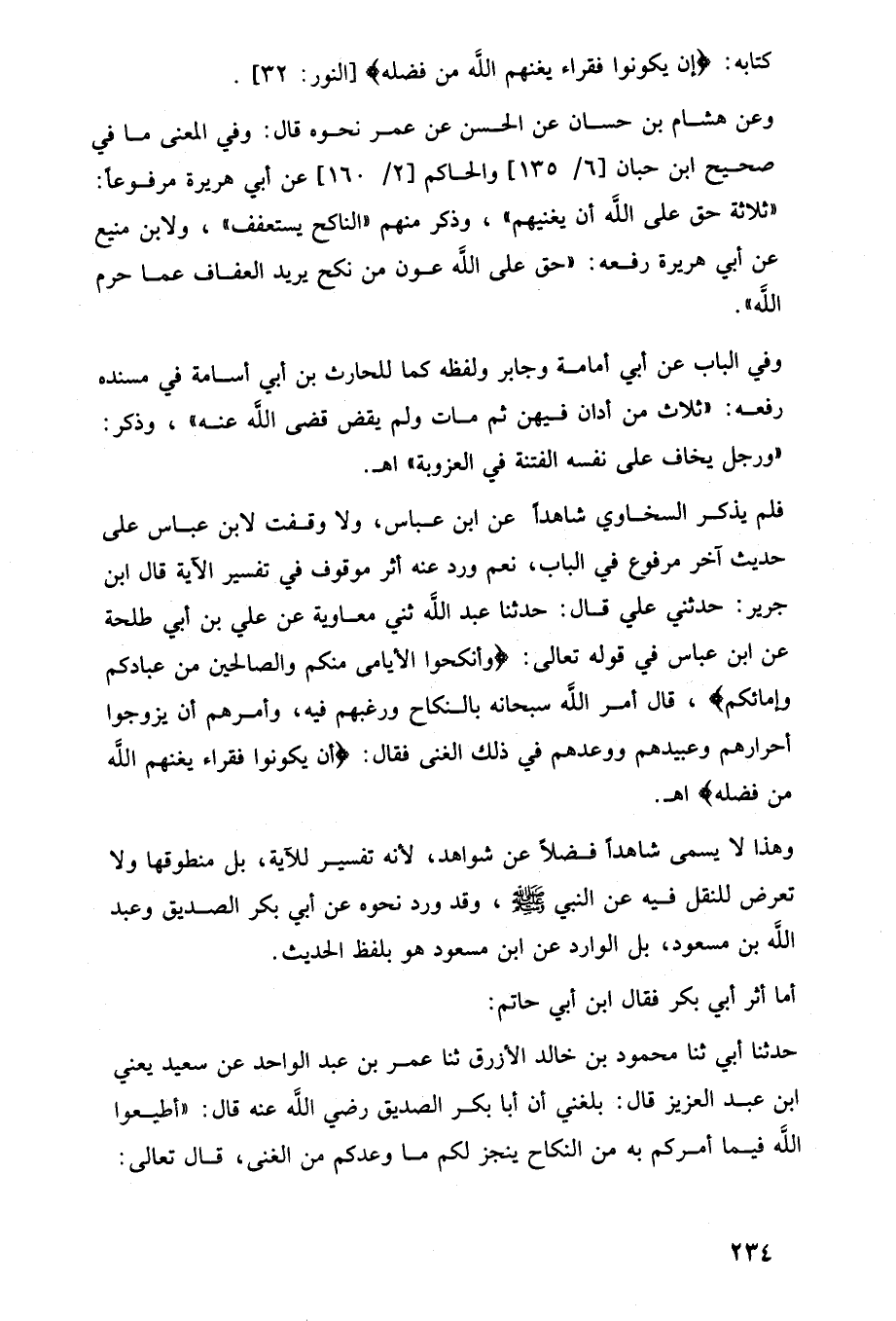 وعن هشام بن حسان عن الحسن عن عمر نحوه قال: وفي المعنى ما في صحيح ابن حبان [6/ 135] والحاكم [2/ 160] عن أبي هريرة مرفوعًا: "ثلاثة حق على اللَّه أن يغنيهم"، وذكر منهم "الناكح يستعفف"، ولابن منيع عن أبي هريرة رفعه: "حق على اللَّه عون من نكح يريد العفاف عما حرم اللَّه".