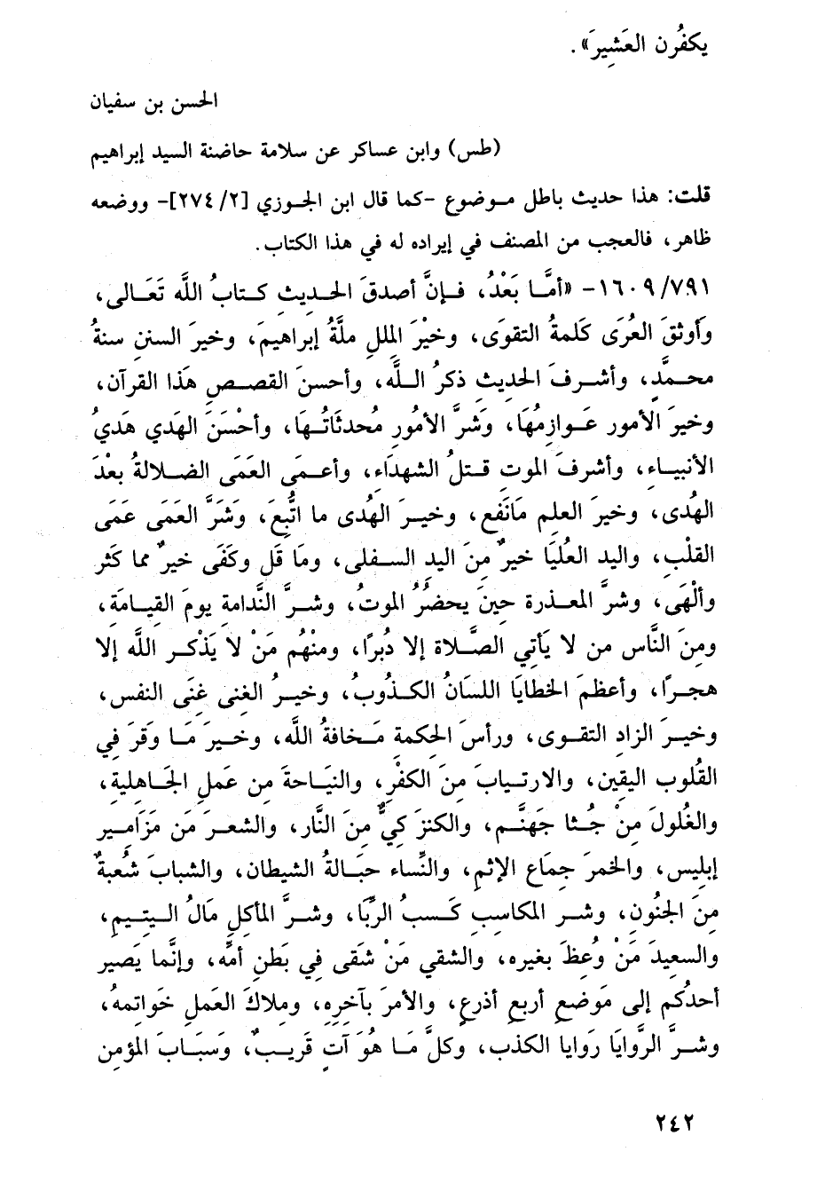 791/ 1609 - "أمَّا بَعْدُ، فإنَّ أصدقَ الحدِيثِ كتابُ اللَّه تَعَالى، وَأوثقَ العُرَى كَلمةُ التقوَى، وخيْرَ المللِ ملَّةُ إبراهيمَ، وخيرَ السننِ سنةُ محمَّدٍ، وأشرفَ الحدِيثِ ذكرُ اللَّهَ، وأحسنَ القصصِ هَذا القرآن، وخيرَ الأمور عَوازِمُهَا، وَشرَّ الأمُورِ مُحدثَاتُهَا، وأحْسَنَ الهَدي هَديُ الأنبياءِ، وأشرفَ الموتِ قتلُ الشهدَاء، وأعمَى العَمَى الضلالةُ بعْدَ الهُدى، وخيرَ العلم مَا نَفع، وخيرَ الهُدى ما اتُّبِعَ، وَشَرَّ العَمَى عَمَى القلْبِ، واليد العُليَا خيرٌ مِنَ اليدِ السفلى، ومَا قَل وكَفَى خيرٌ مما كَثر وألْهَى، وشرَّ المعذرة حِينَ يحضُرُ الموتُ، وشرَّ النَّدامة يومَ القِيامَة، ومِنَ النَّاس من لا يَأتِي الصَّلاة إلا دُبرًا، ومنْهُم مَنْ لَا يَذْكر اللَّه إِلا هجرًا، وأعظمَ الخطايَا اللسَانُ الكذُوبُ، وخيرُ الغِنى غِنَى النفس، وخيرَ الزادِ التقوى، ورأسَ الحِكمةِ مَخافةُ اللَّه، وخيرَ مَا وَقرَ فِي القُلوب اليقين، والارتيابَ مِنَ الكفْرِ، والنيَاحةَ مِن عَملِ الجَاهِليةِ، والغُلولَ مِنْ جُثا جَهنَّم، والكنزَ كِيٌّ مِنَ النَّار، والشعرَ مَن مَزَامِير إبلِيس، والخمرَ جِمَاع الإثم، والنِّساء حبَالةُ الشيطان، والشبابَ شُعبةٌ مِنَ الجنُونِ، وشر المكاسِبِ كَسبُ الرِّبَا، وشرَّ المأكِلِ مَالُ اليتِيم، والسعِيدَ مَنْ وُعِظَ بغيره، والشقي مَنْ شَقى فِي بَطنِ أمِّه، وإنَّما يَصير أحدُكم إلى مَوضع أربعِ أذرعٍ، والأمرَ بآخِرِهِ، ومِلاكَ العَملِ خَواتمهُ، وشرَّ الرَّوايَا رَوايا الكذب، وكلَّ مَا هُوَ آتٍ قَريبٌ، وَسبَابَ المَؤمِن