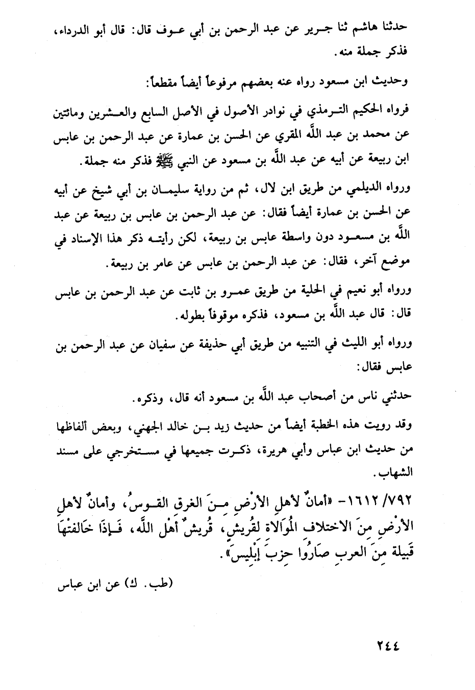 ورواه أبو نعيم في الحلية من طريق عمرو بن ثابت عن عبد الرحمن بن عابس قال: قال عبد اللَّه بن مسعود، فذكره موقوفًا بطوله.