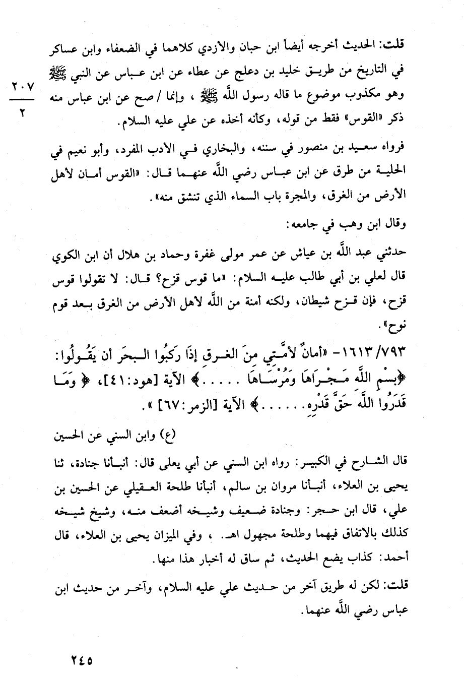 حدثني عبد اللَّه بن عياش عن عمر مولى غفرة وحماد بن هلال أن ابن الكوي قال لعلي بن أبي طالب عليه السلام: "ما قوس قزح؟ قال: لا تقولوا قوس قزح، فإن قزح شيطان، ولكنه أمنة من اللَّه لأهل الأرض من الغرق بعد قوم نوح".