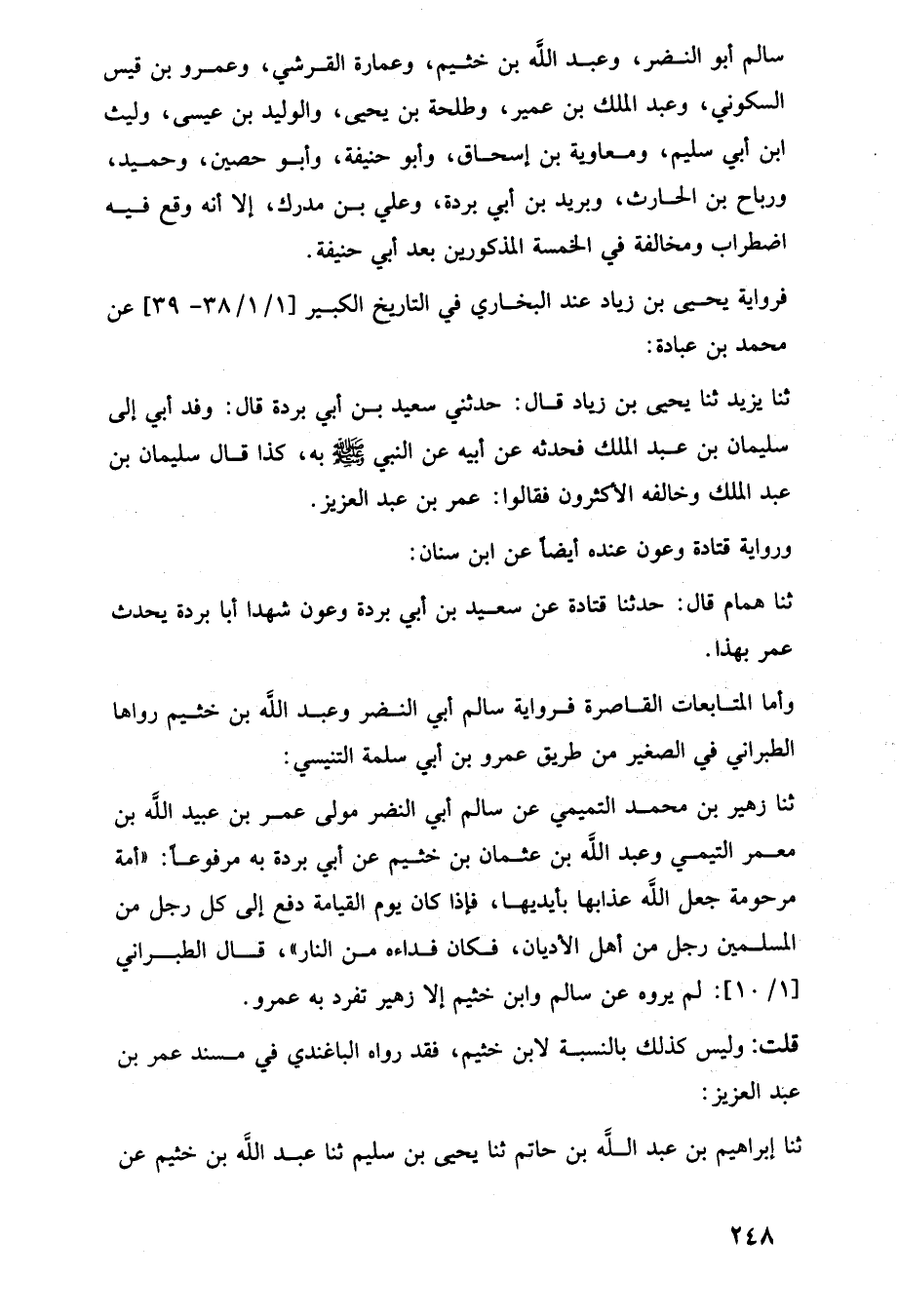 ثنا زهير بن محمد التميمي عن سالم أبي النضر مولى عمر بن عبيد اللَّه بن معمر التيمي وعبد اللَّه بن عثمان بن خثيم عن أبي بردة به مرفوعًا: "أمة مرحومة جعل اللَّه عذابها بأيديها، فإذا كان يوم القيامة دفع إلى كل رجل من المسلمين رجل من أهل الأديان، فكان فداءه من النار"، قال الطبراني [1/ 10]: لم يروه عن سالم وابن خثيم إلا زهير تفرد به عمرو.