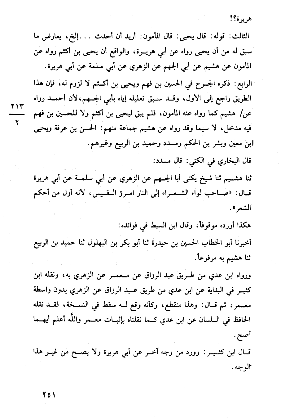 الثالث: قوله: قال يحيى: قال المأمون: أريد أن أحدث. . . إلخ، يعارض ما سبق له من أن يحيى رواه عن أبي هريرة، والواقع أن يحيى بن أكثم رواه عن المأمون عن هشيم عن أبي الجهم عن الزهري عن أبي سلمة عن أبي هريرة.