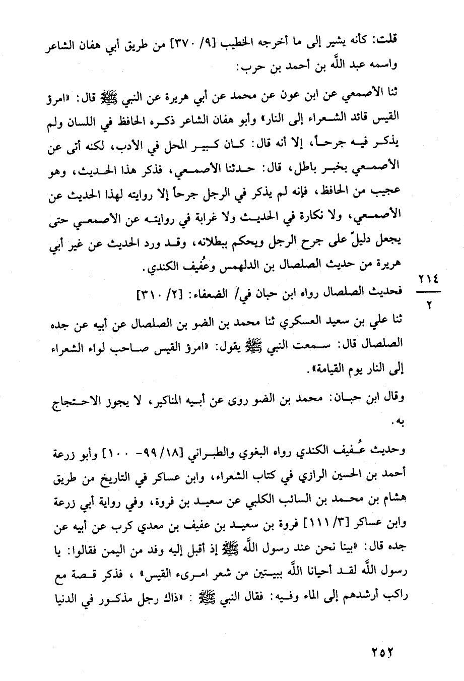 ثنا الأصمعي عن ابن عون عن محمد عن أبي هريرة عن النبي -صلى اللَّه عليه وسلم- قال: "امرؤ القيس قائد الشعراء إلى النار" وأبو هفان الشاعر ذكره الحافظ في اللسان ولم يذكر فيه جرحًا، إلا أنه قال: كان كبير المحل في الأدب، لكنه أتى عن الأصمعي بخبر باطل، قال: حدثنا الأصمعي، فذكر هذا الحديث، وهو عجيب من الحافظ، فإنه لم يذكر في الرجل جرحًا إلا روايته لهذا الحديث عن الأصمعي، ولا نكارة في الحديث ولا غرابة في روايته عن الأصمعي حتى يجعل دليل على جرح الرجل ويحكم ببطلانه، وقد ورد الحديث عن غير أبي هريرة من حديث الصلصال بن الدلهمس وعُفيف الكندي.