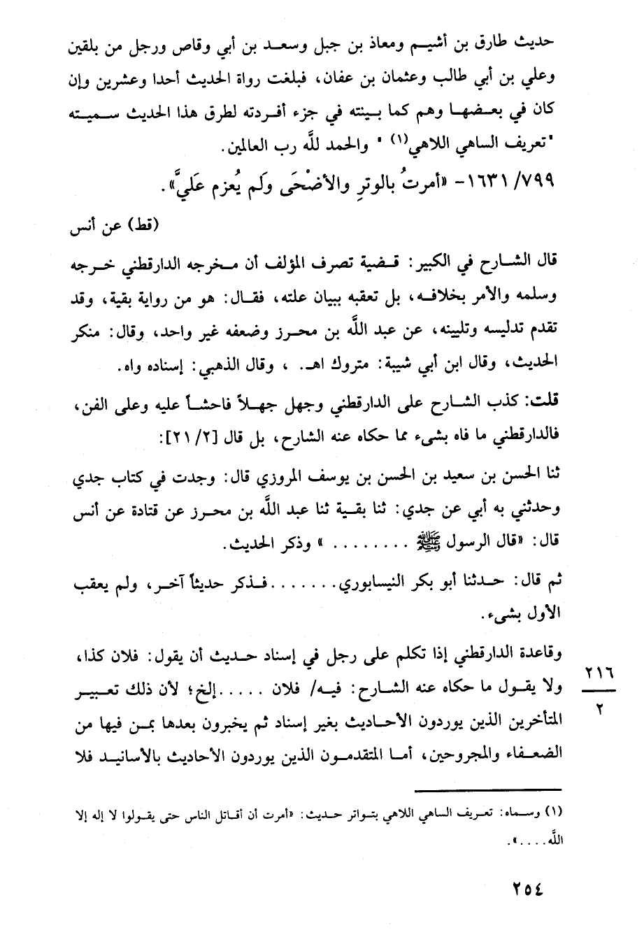 799/ 1631 - "أمرتُ بالوترِ والأضْحَى وَلم يُعزم عَليَّ". (قط) عن أنس