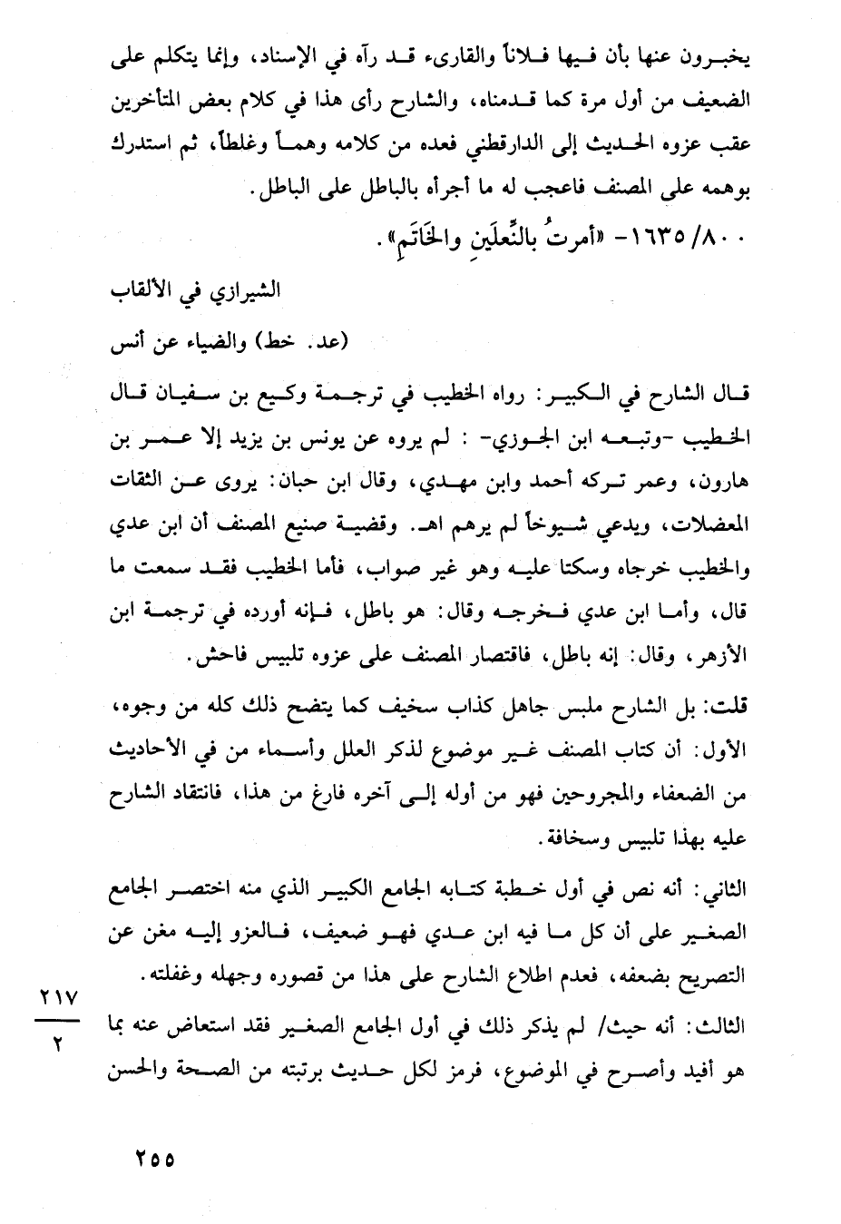 قلت: بل الشارح ملبس جاهل كذاب سخيف كما يتضح ذلك كله من وجوه، الأول: أن كتاب المصنف غير موضوع لذكر العلل وأسماء من في الأحاديث من الضعفاء والمجروحين فهو من أوله إلى آخره فارغ من هذا، فانتقاد الشارح عليه بهذا تلبيس وسخافة.