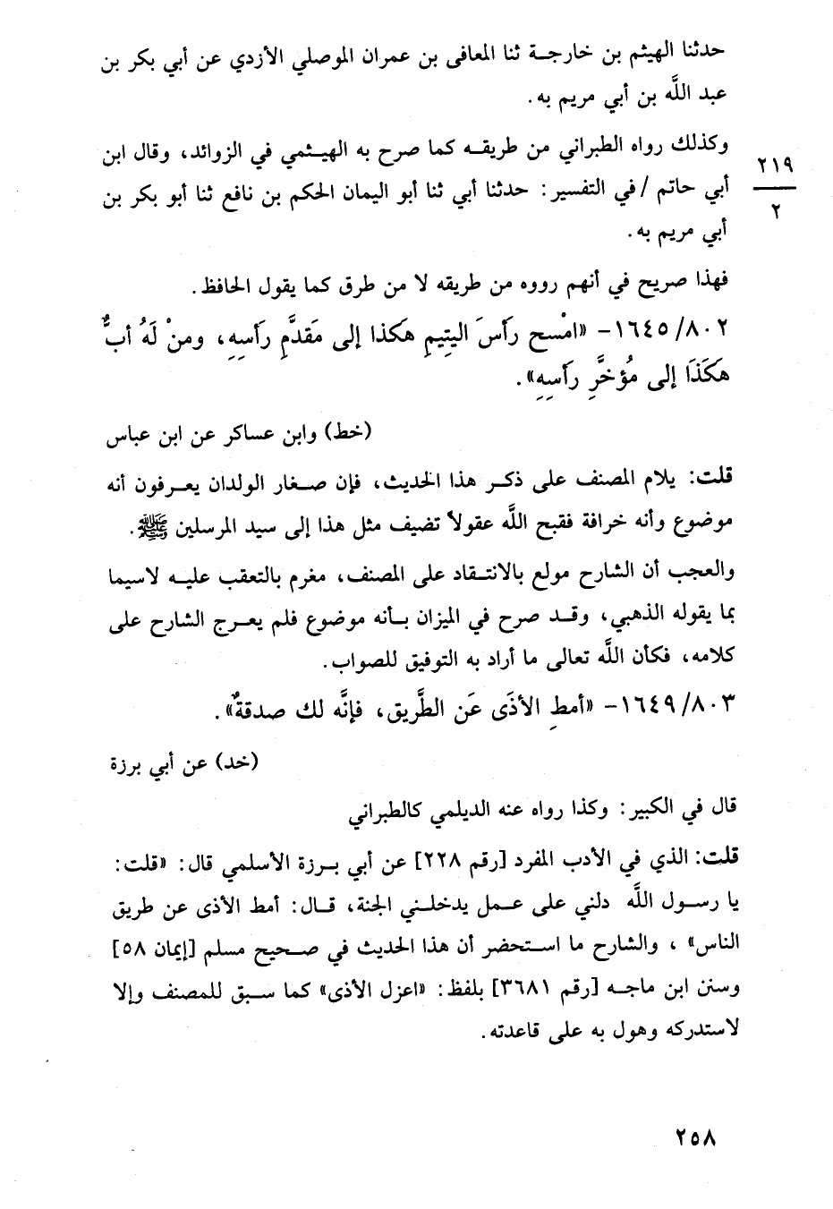 802/ 1645 - "امْسح رَأسَ اليتِيم هَكذا إلى مَقدَّمِ رَأسِهِ، ومنْ لَهُ أبٌّ هكذَا إلى مُؤخَّرِ رَأسِهِ".