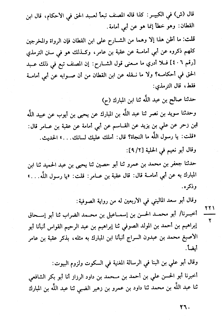 قلت: ما أظن هذا إلا وهما من الشارح على ابن القطان فإن الرواة والمخرجين كلهم ذكروه عن أبي أمامة عن عقبة بن عامر، وكذلك هو في سنن الترمذي [رقم 406] فلا أدري ما معنى قول الشارح: إن المصنف تبع في ذلك عبد الحق في أحكامه؟ ولا ما نقله عن ابن القطان من أن صوابه عن أبي أمامة فقط، قال الترمذي: