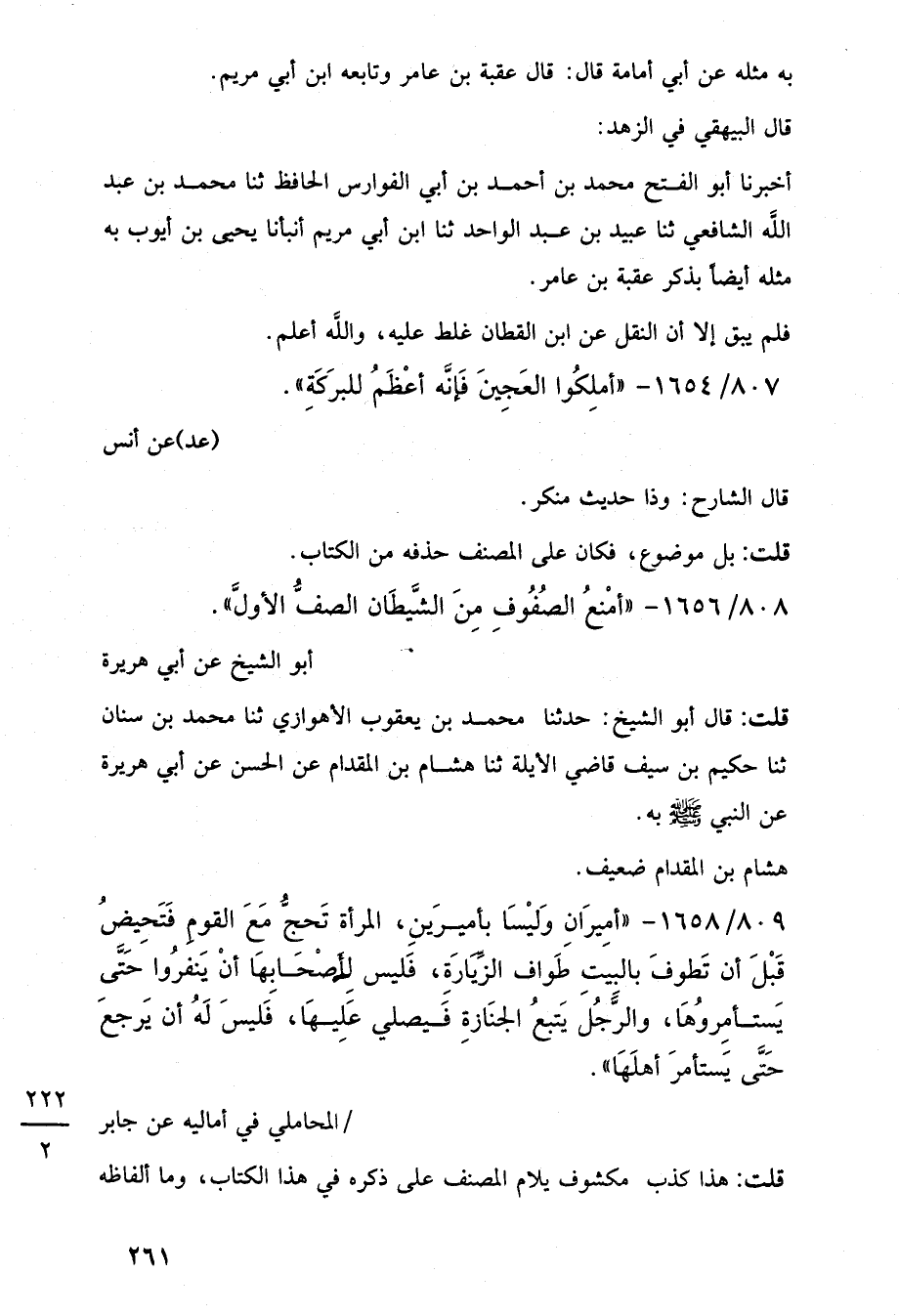 809/ 1658 - "أمِيرَانِ وَليْسَا بأميرَينِ، المرأة تَحجُّ مَعَ القومِ فَتَحِيضُ قَبْلَ أن تَطوفَ بالبيَتِ طَواف الزِّيَارَةِ، فَليس لأَصْحَابِهَا أنْ يَنفرُوا حَتَّى يَستأمِروُهَا، والرَّجُل يَتبعُ الجنَازةِ فَيصلي عَلِيهَا، فَليسَ لَهُ أن يَرجعَ حَتَّى يَستأمرَ أهلَهَا".