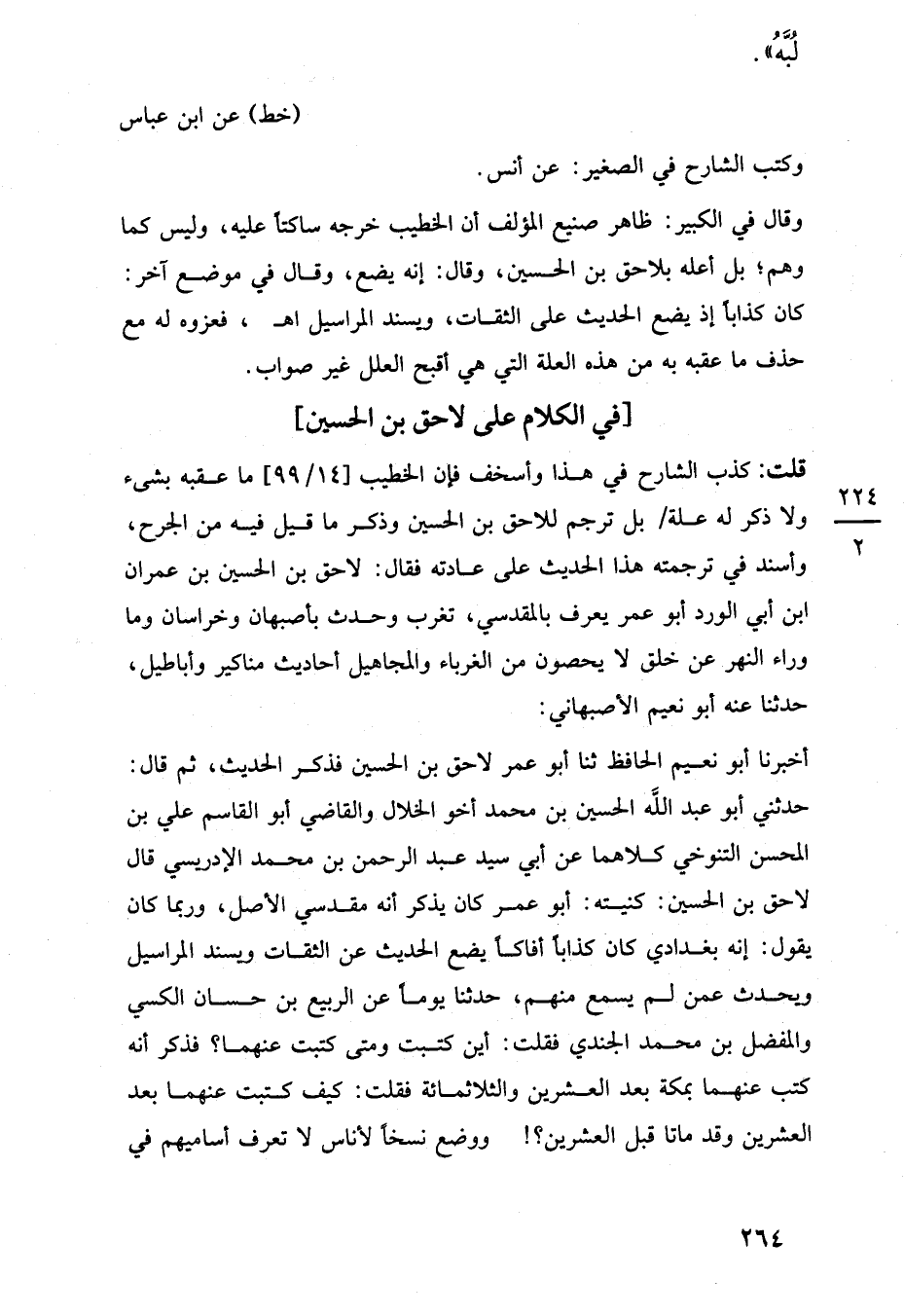 قلت: كذب الشارح في هذا وأسخف فإن الخطيب [14/ 99] ما عقبه بشيء ولا ذكر له علة بل ترجم للاحق بن الحسين وذكر ما قيل فيه من الجرح، وأسند في ترجمته هذا الحديث على عادته فقال: لاحق بن الحسين بن عمران ابن أبي الورد أبو عمر يعرف بالمقدسي، تغرب وحدث بأصبهان وخراسان وما وراء النهر عن خلق لا يحصون من الغرباء والمجاهيل أحاديث مناكير وأباطيل، حدثنا عنه أبو نعيم الأصبهاني:
