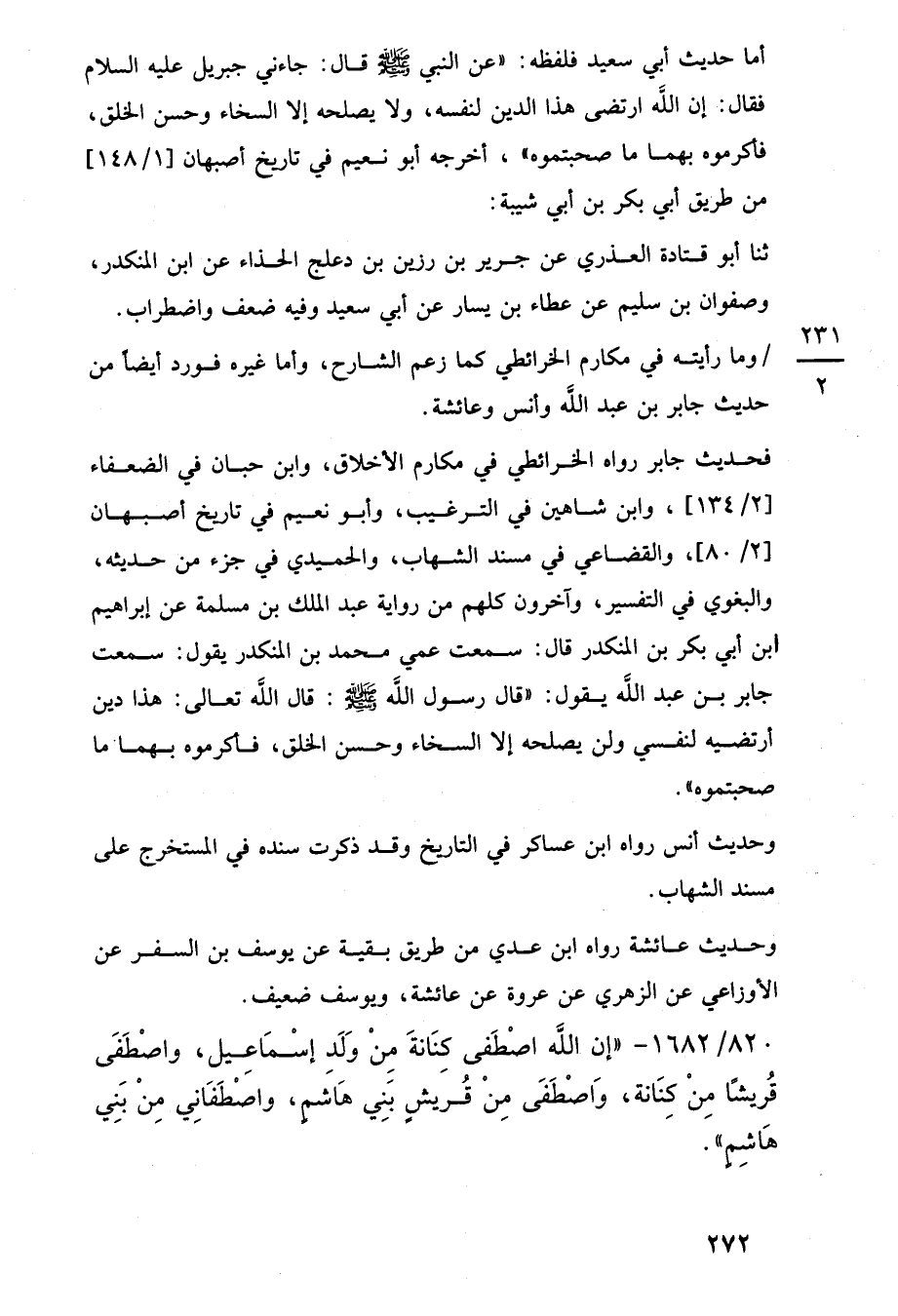 فحديث جابر رواه الخرائطي في مكارم الأخلاق، وابن حبان في الضعفاء [2/ 134]، وابن شاهين في الترغيب، وأبو نعيم في تاريخ أصبهان [2/ 80]، والقضاعي في مسند الشهاب، والحميدي في جزء من حديثه، والبغوي في التفسير، وآخرون كلهم من رواية عبد الملك بن مسلمة عن إبراهيم ابن أبي بكر بن المنكدر قال: سمعت عمي محمد بن المنكدر يقول: سمعت جابر بن عبد اللَّه يقول: "قال رسول اللَّه -صلى اللَّه عليه وسلم-: قال اللَّه تعالى: هذا دين أرتضيه لنفسي ولن يصلحه إلا السخاء وحسن الخلق، فأكرموه بهما ما صحبتموه".