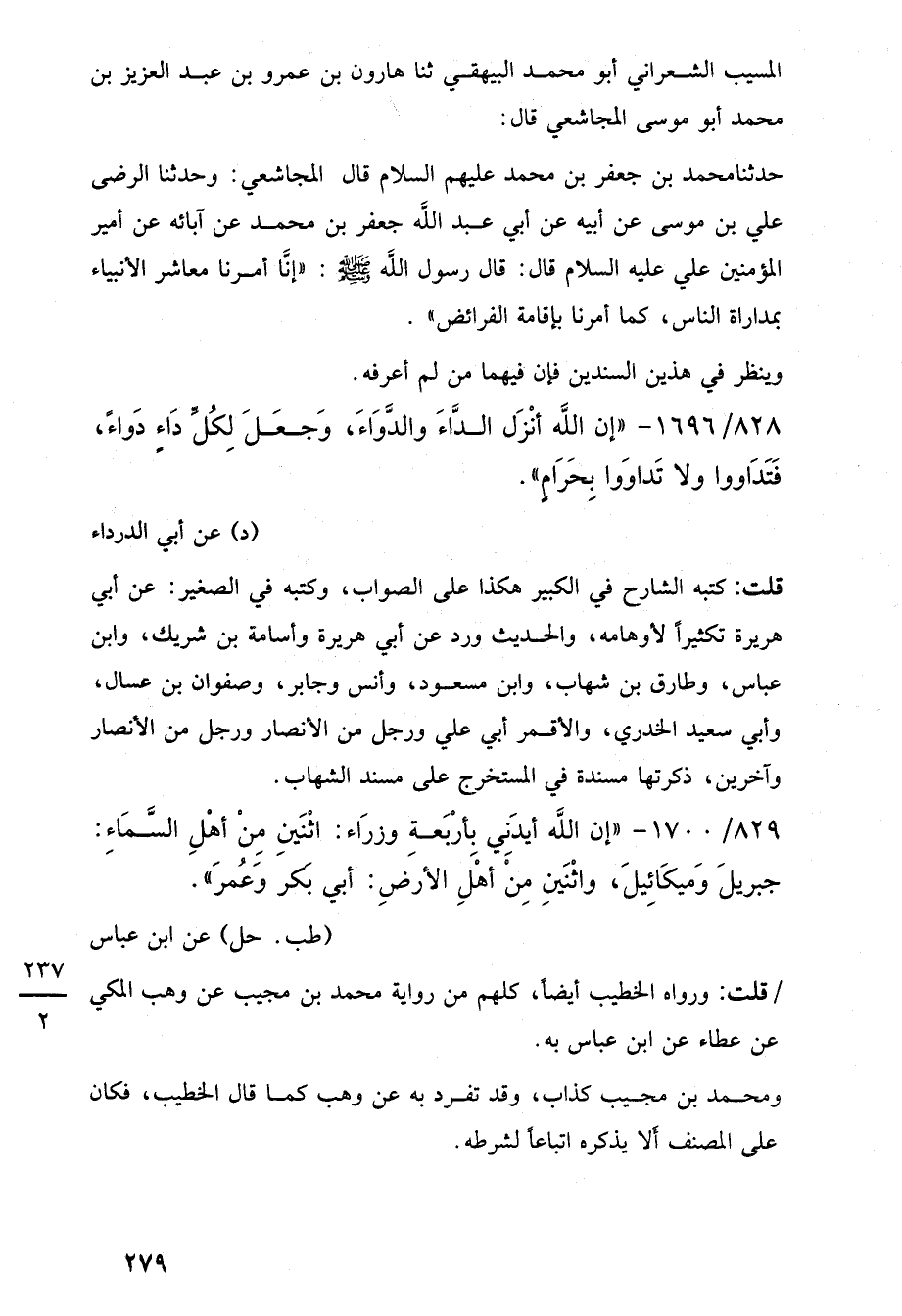 828/ 1696 - "إن اللَّه أنْزَل الدَّاءَ والدَّوَاءَ، وَجعَلَ لِكُلِّ دَاءٍ دَواءً، فَتَدَاووا ولا تَداوَوا بِحَرَامٍ".