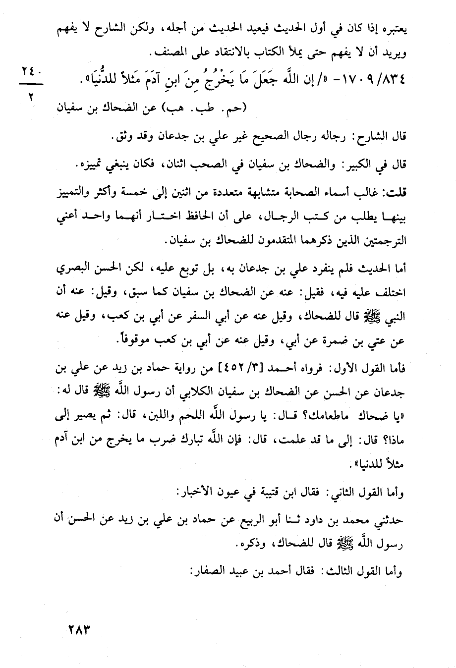 فأما القول الأول: فرواه أحمد [3/ 452] من رواية حماد بن زيد عن علي بن جدعان عن الحسن عن الضحاك بن سفيان الكلابي أن رسول اللَّه -صلى اللَّه عليه وسلم- قال له: "يا ضحاك ما طعامك؟ قال: يا رسول اللَّه اللحم واللبن، قال: ثم يصير إلى ماذا؟ قال: إلى ما قد علمت، قال: فإن اللَّه تبارك ضرب ما يخرج من ابن آدم مثلًا للدنيا".
