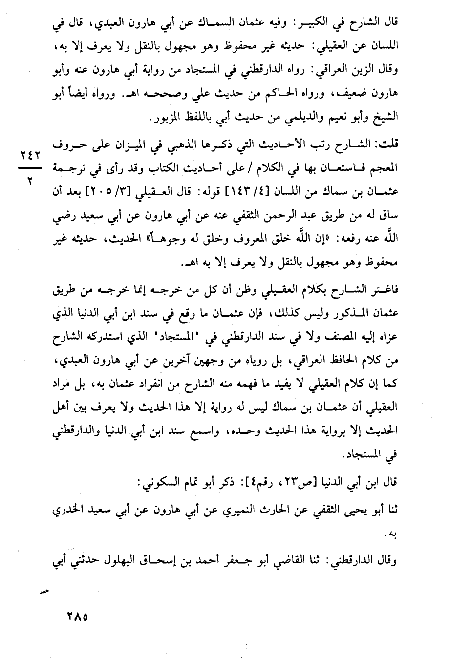 فاغتر الشارح بكلام العقيلي وظن أن كل من خرجه إنما خرجه من طريق عثمان المذكور وليس كذلك، فإن عثمان ما وقع في سند ابن أبي الدنيا الذي عزاه إليه المصنف ولا في سند الدارقطني في "المستجاد" الذي استدركه الشارح من كلام الحافظ العراقي، بل روياه من وجهين آخرين عن أبي هارون العبدي، كما إن كلام العقيلي لا يفيد ما فهمه منه الشارح من انفراد عثمان به، بل مراد العقيلي أن عثمان بن سماك ليس له رواية إلا هذا الحديث ولا يعرف بين أهل الحديث إلا برواية هذا الحديث وحده، واسمع سند ابن أبي الدنيا والدارقطني في المستجاد.