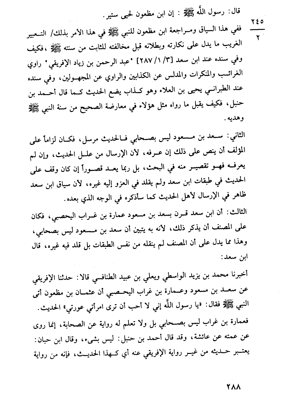 أخبرنا محمد بن يزيد الواسطي ويعلي بن عبيد الطنافسي قالا: حدثنا الإفريقي عن سعد بن مسعود وعمارة بن غراب اليحصبي أن عثمان بن مظعون أتى النبي -صلى اللَّه عليه وسلم- فقال: "يا رسول اللَّه إني لا أحب أن ترى امرأتي عورتي" الحديث.