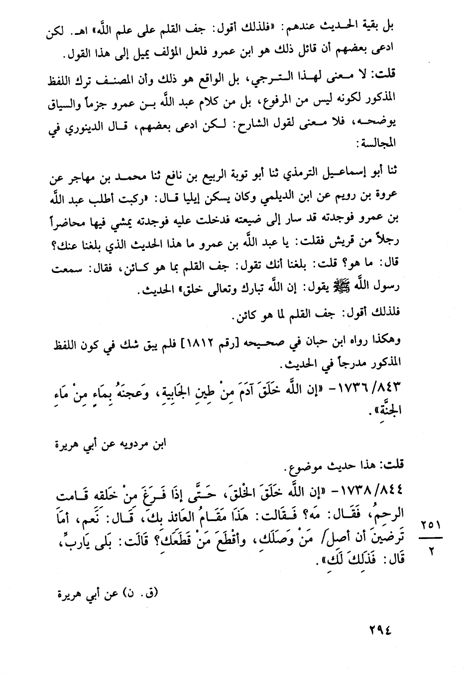 843/ 1736 - "إنَّ اللَّه خَلَقَ آدَمَ منْ طِينِ الجَابِيةِ، وَعجنَهُ بِمَاءٍ مِنْ مَاءِ الجنَّةِ".