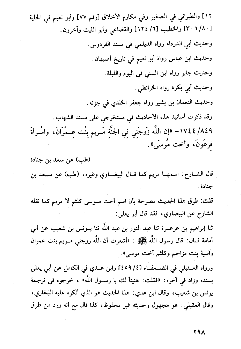 849/ 1744 - "إن اللَّه زَوجَنِي فِي الجنَّةِ مَريم بِنْت عِمْرَانَ، وامْرأةَ فِرعَونَ، وأخت مُوسَى".