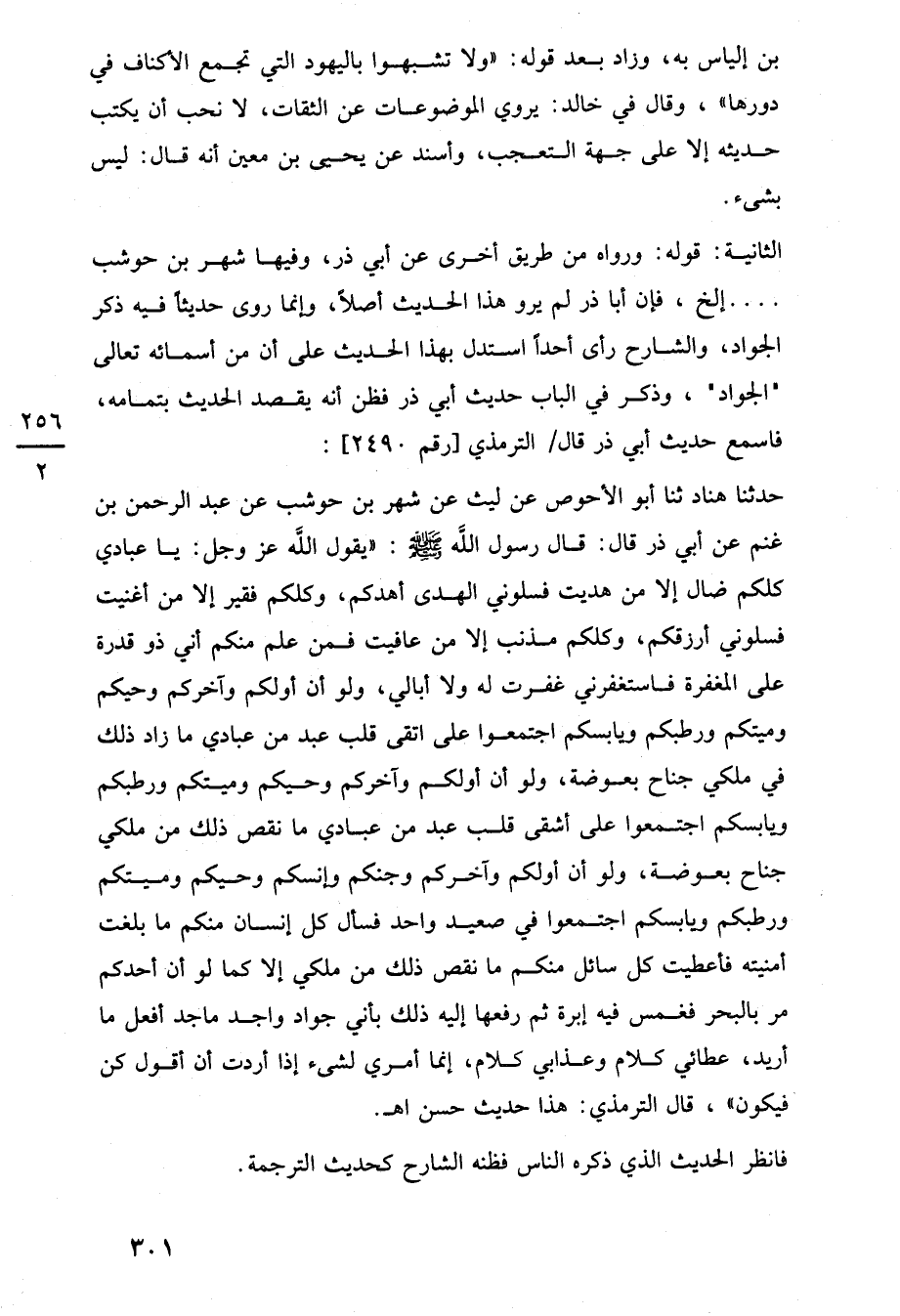 حدثنا هناد ثنا أبو الأحوص عن ليث عن شهر بن حوشب عن عبد الرحمن بن غنم عن أبي ذر قال: قال رسول اللَّه -صلى اللَّه عليه وسلم-: "يقول اللَّه عز وجل: يا عبادي كلكم ضال إلا من هديت فسلوني الهدى أهدكم، وكلكم فقير إلا من أغنيت فسلوني أرزقكم، وكلكم مذنب إلا من عافيت فمن علم منكم أني ذو قدرة على المغفرة فاستغفرني غفرت له ولا أبالي، ولو أن أولكم وآخركم وحيكم وميتكم ورطبكم ويابسكم اجتمعوا على اتقى قلب عبد من عبادي ما زاد ذلك في ملكي جناح بعوضة، ولو أن أولكم وآخركم وحيكم وميتكم ورطبكم ويابسكم اجتمعوا على أشقى قلب عبد من عبادي ما نقص ذلك من ملكي جناح بعوضة، ولو أن أولكم وآخركم وجنكم وإنسكم وحيكم وميتكم ورطبكم ويابسكم اجتمعوا في صعيد واحد فسأل كل إنسان منكم ما بلغت أمنيته فأعطيت كل سائل منكم ما نقص ذلك من ملكي إلا كما لو أن أحدكم مر بالبحر فغمس فيه إبرة ثم رفعها إليه ذلك بأني جواد واجد ماجد أفعل ما أريد، عطائي كلام وعذابي كلام، إنما أمري لشيء إذا أردت أن أقول كن فيكون"، قال الترمذي: هذا حديث حسن اهـ.