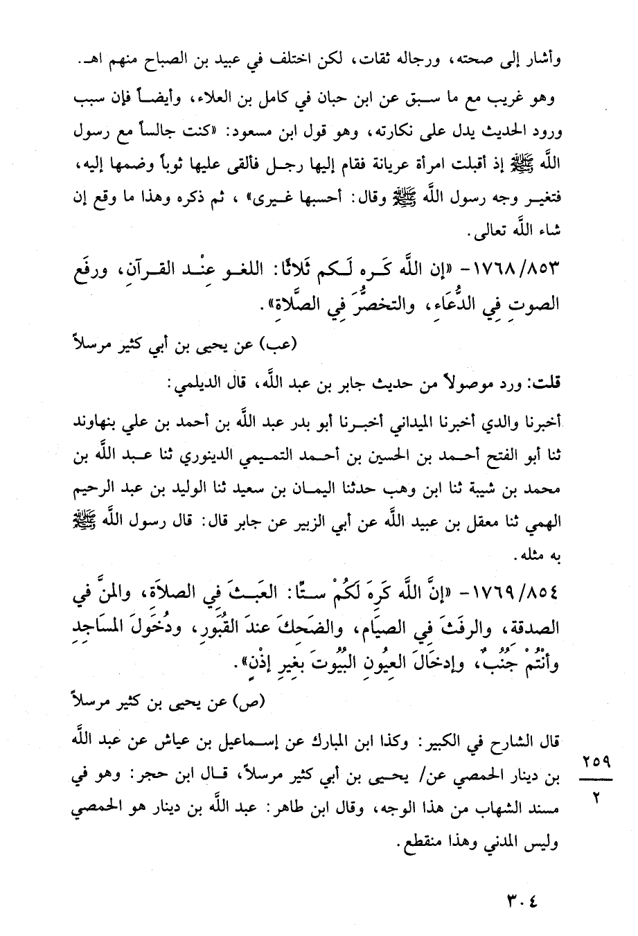 853/ 1768 - "إن اللَّه كَره لَكم ثَلاثًا: اللغو عنْد القرآنِ، ورفَع الصوتِ في الدُّعَاءِ، والتخصُّرَ فِي الصَّلاةِ".