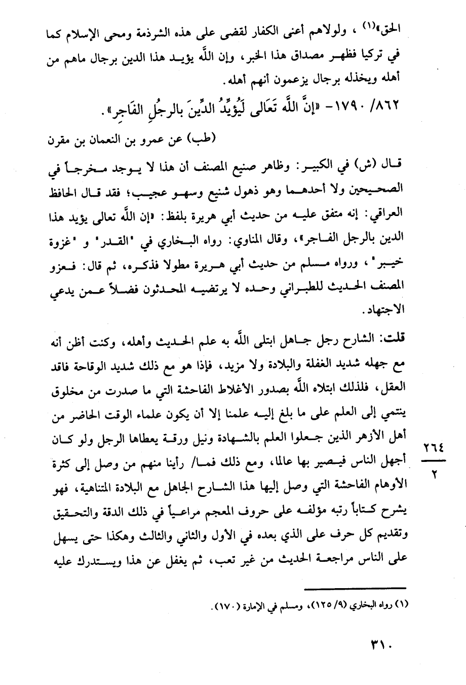 قال (ش) في الكبير: وظاهر صنيع المصنف أن هذا لا يوجد مخرجًا في الصحيحين ولا أحدهما وهو ذهول شنيع وسهو عجيب؛ فقد قال الحافظ العراقي: إنه متفق عليه من حديث أبي هريرة بلفظ: "إن اللَّه تعالى يؤيد هذا الدين بالرجل الفاجر"، وقال المناوي: رواه البخاري في "القدر" و"غزوة خيبر"، ورواه مسلم من حديث أبي هريرة مطولًا فذكره، ثم قال: فعزو المصنف الحديث للطبراني وحده لا يرتضيه المحدثون فضلًا عمن يدعي الاجتهاد.